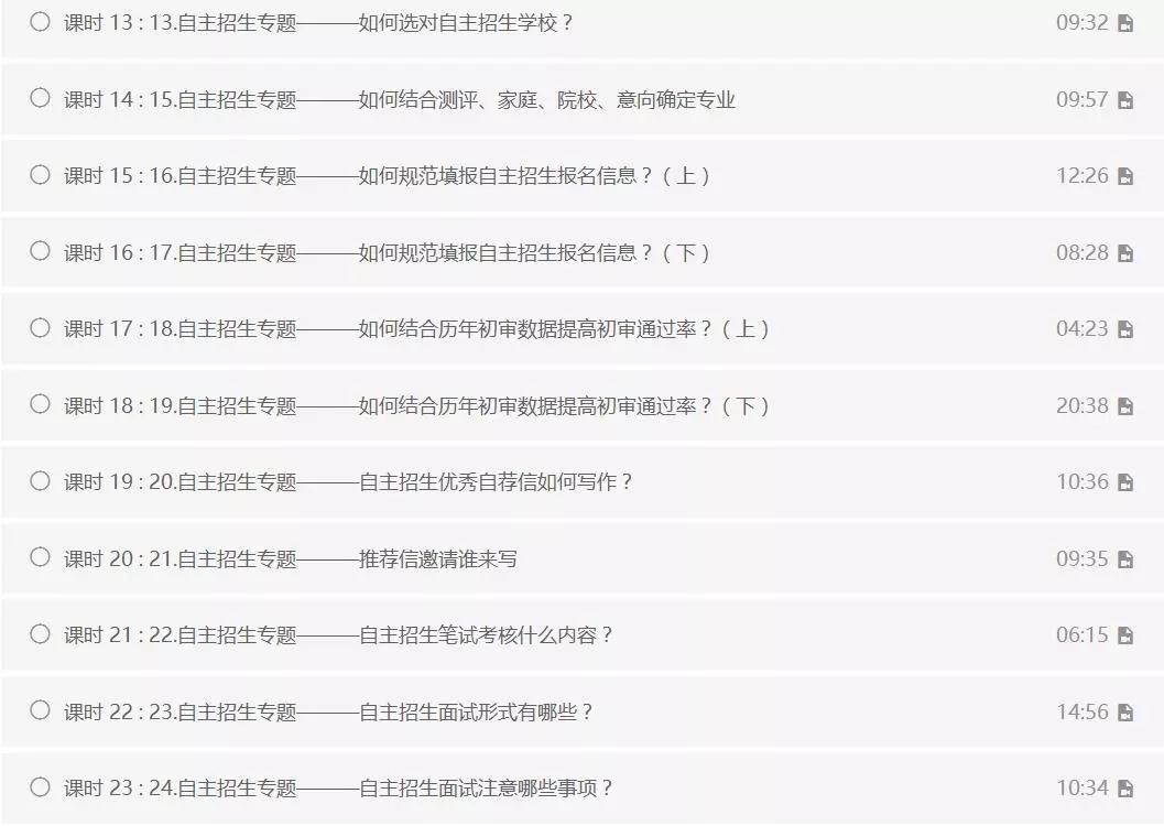 其他課時里的內(nèi)容包括了高中不同年級的學生如何準備自招;自招優(yōu)惠分析;怎么樣找出門檻低、降分多的院校;如何選對自招院校;自主招生簡章關注哪幾點信息;如何寫出優(yōu)秀的自薦信;自主招生筆試考什么,面試注意哪些;如何做到自招院校的“沖、穩(wěn)、?!保蝗绾巫龊么髮W規(guī)劃等等。