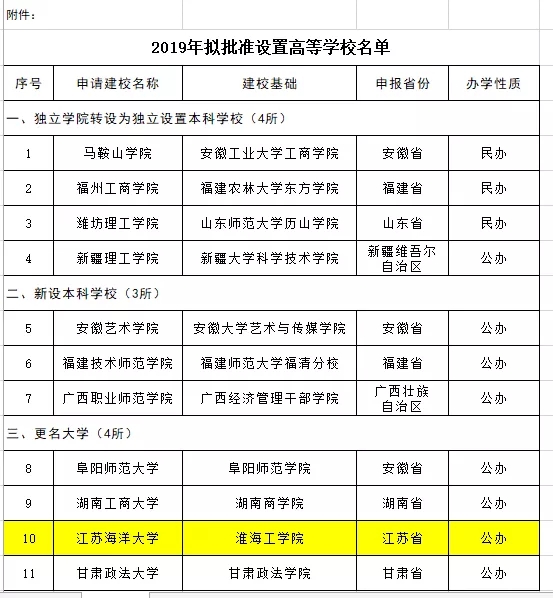 ★2019年5月23日,教育部網(wǎng)站上公示的《關(guān)于2019年擬批準設(shè)置高等學校的公示》中,淮海工學院更名為“江蘇海洋大學”!