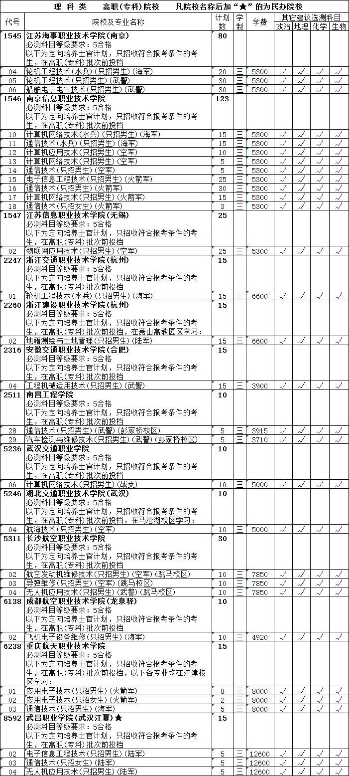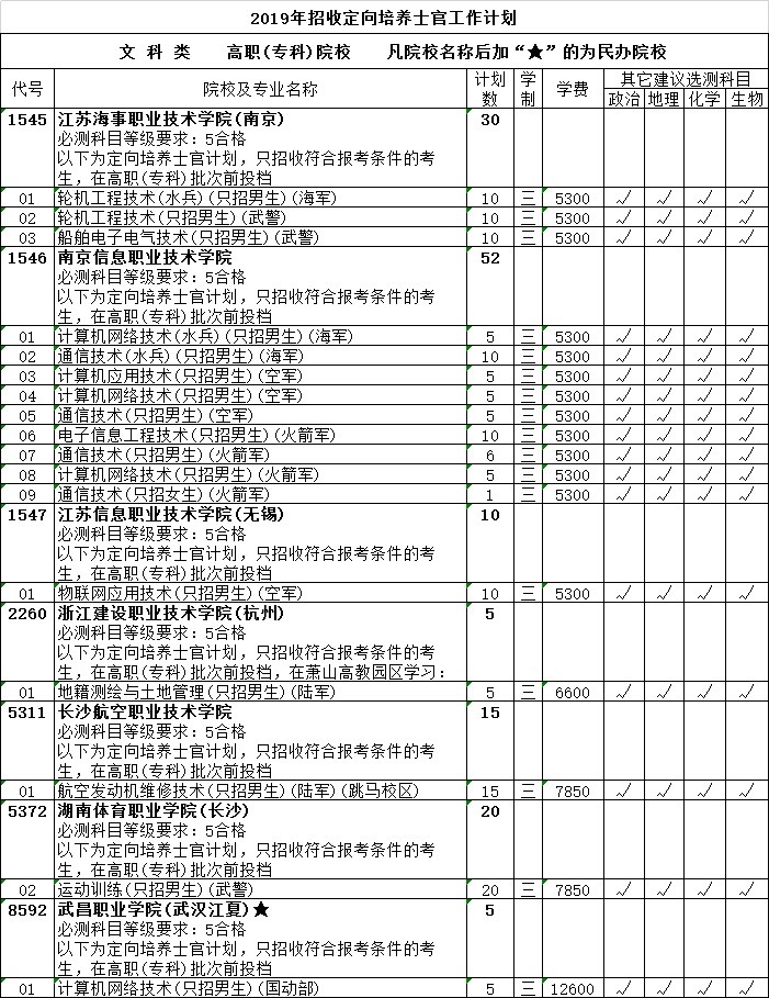 2019年招收定向培養(yǎng)士官工作計劃出爐了,在國家核定的14所地方高校2019年高職(??疲哟握猩媱潈?nèi),面向我省的生源,為陸軍、海軍、空軍、火箭軍、戰(zhàn)略支援部隊、武警部隊和國防動員部招收定向培養(yǎng)士官 510人(女士官11人)。我省的3所高校分別面向江蘇、浙江、安徽、江西、山東、河南、湖南、陜西和甘肅省招收定向培養(yǎng)士官生940人。