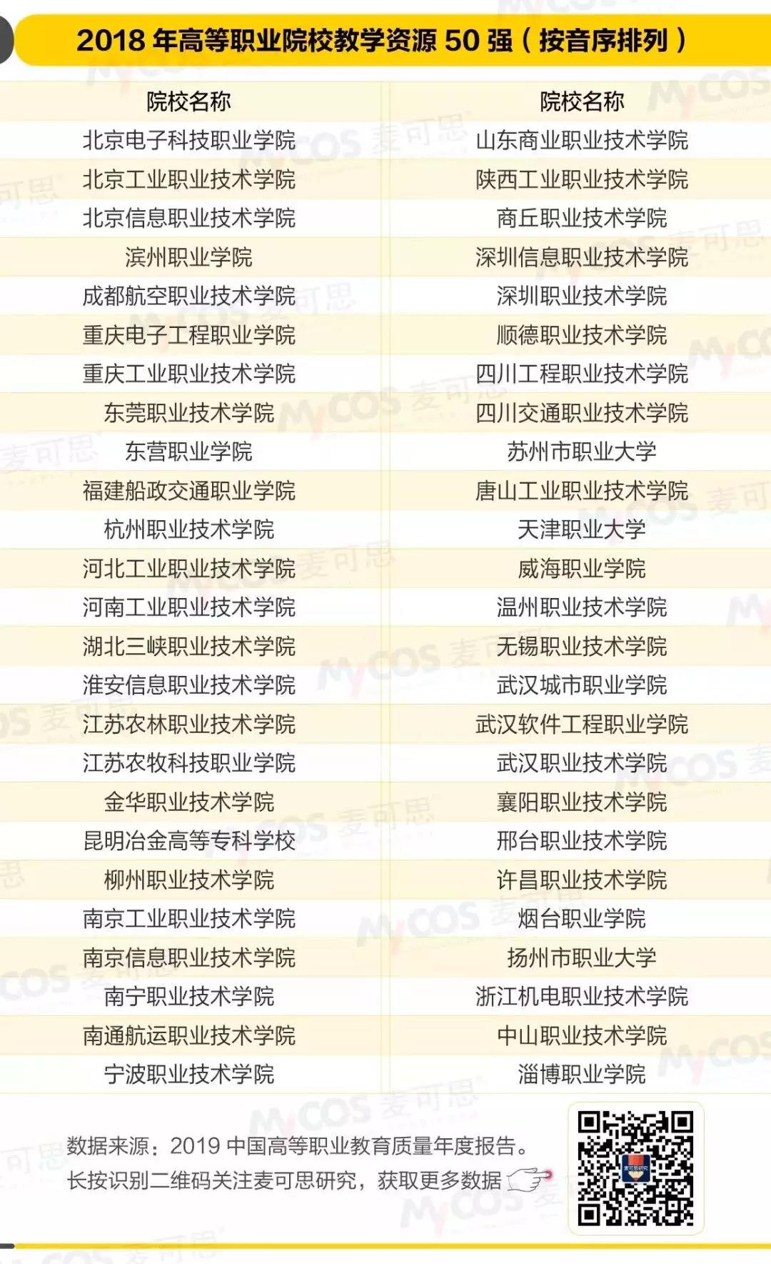 河北工業(yè)職業(yè)技術(shù)學(xué)院、山東商業(yè)職業(yè)技術(shù)學(xué)院、深圳職業(yè)技術(shù)學(xué)院、四川交通職業(yè)技術(shù)學(xué)院、溫州職業(yè)技術(shù)學(xué)院、邢臺(tái)職業(yè)技術(shù)學(xué)院、浙江機(jī)電職業(yè)技術(shù)學(xué)院7所高校上榜育人成效50強(qiáng)、教學(xué)資源50強(qiáng)、服務(wù)貢獻(xiàn)50強(qiáng)3個(gè)榜單,且均為優(yōu)質(zhì)專(zhuān)科高等職業(yè)院校。