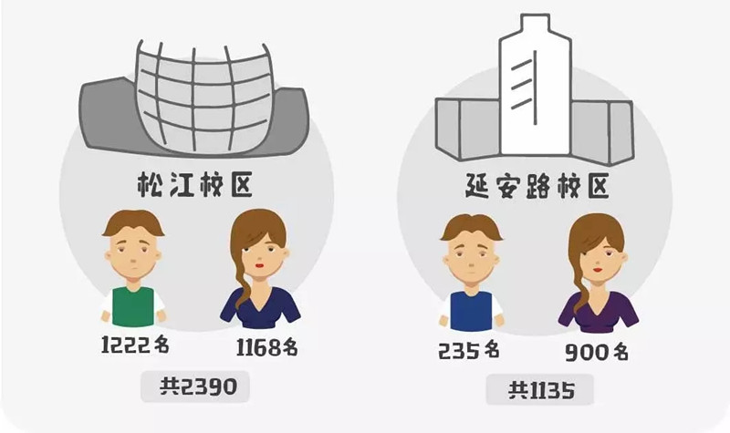 最受關(guān)注也許是男女比例,從東華兩校區(qū)來看:松江校區(qū)近乎1:1;延安路校區(qū)約為1:3.8。