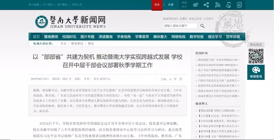 據(jù)暨南大學(xué)新聞網(wǎng)消息,8月6日,中央統(tǒng)戰(zhàn)部、教育部、廣東省人民政府印發(fā)《關(guān)于共同建設(shè)暨南大學(xué)的意見》(統(tǒng)發(fā)〔2019〕69號文),決定共同建設(shè)暨南大學(xué)。根據(jù)意見,中央統(tǒng)戰(zhàn)部、教育部、廣東省人民政府將在資金、政策、規(guī)劃等方面予以學(xué)校支持和傾斜,旨在進(jìn)一步支持暨南大學(xué)全面推進(jìn)“雙一流”建設(shè)步伐,提升學(xué)校服務(wù)國家重大戰(zhàn)略、地方發(fā)展需求能力,傳承中華優(yōu)秀傳統(tǒng)文化,加快建成高水平大學(xué)。