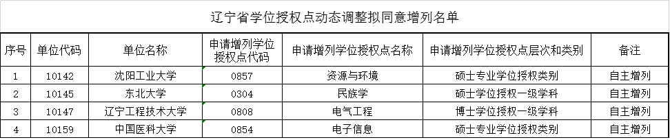 根據(jù)《國務(wù)院學(xué)位委員會關(guān)于做好博士碩士學(xué)位授權(quán)學(xué)科和專業(yè)學(xué)位授權(quán)類別動態(tài)調(diào)整工作的通知》(學(xué)位〔2017〕15號)精神,經(jīng)院校自行審核申報(bào)、遼寧省學(xué)位辦復(fù)核,2019年度擬同意撤銷沈陽理工大學(xué)軟件工程等6個(gè)學(xué)位授權(quán)點(diǎn),擬同意增列沈陽工業(yè)大學(xué)資源與環(huán)境等4個(gè)學(xué)位授權(quán)點(diǎn)。