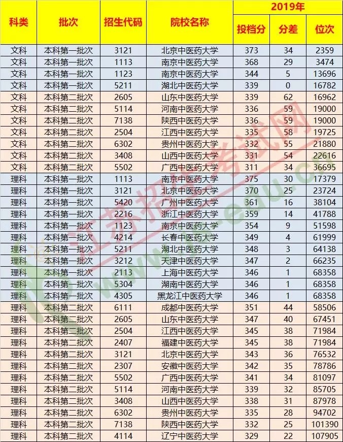 a、本表格數(shù)據(jù)包含:2019年本一本二批次公辦中醫(yī)藥院校錄取分;2018年本一本二批次中醫(yī)藥院校中醫(yī)藥專業(yè)錄取分,不含非中醫(yī)藥專業(yè)數(shù)據(jù)。