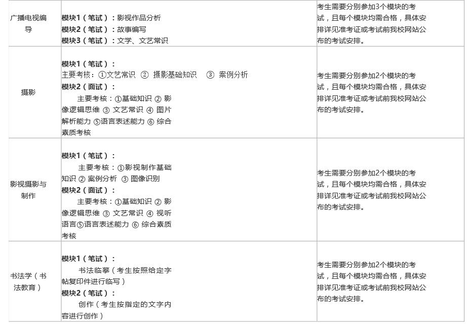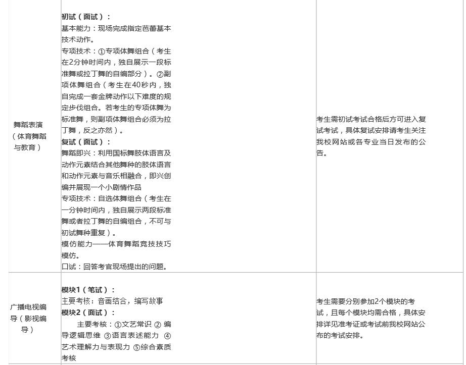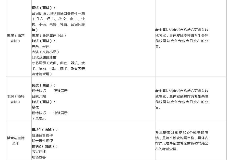 3.表演(影視表演)、表演(曲藝表演)、表演(模特表演)、舞蹈表演(體育舞蹈與教育)專業(yè),需初試合格后方可進(jìn)入復(fù)試考試,其它專業(yè)需分別參加各模塊的考試,且每個(gè)模塊均需合格。
