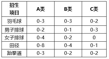 當(dāng)某一項(xiàng)目C類或B類擬簽約生源不足時(shí),該項(xiàng)目剩余C類或B類簽約名額可依次調(diào)整到田徑、羽毛球、跆拳道。