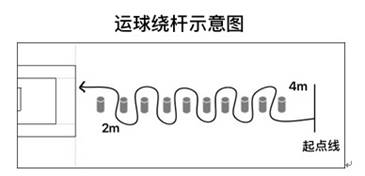 方法:從起點處運(yùn)球繞過10根桿后起腳射門(起點距離第一根桿4米,桿間距2米,最后1根桿距離罰球區(qū)線2米,射門時不能越過罰球區(qū))。
