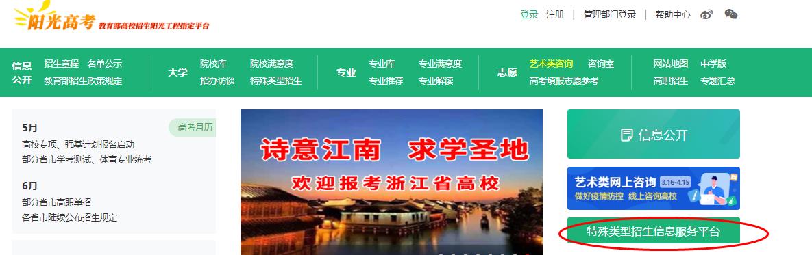 首先,進(jìn)入『陽光高考信息平臺(tái)』,在首頁右側(cè)找到『特殊類型招生信息服務(wù)平臺(tái)』,進(jìn)入后選擇『綜合評(píng)價(jià)』模塊。如果您還沒有賬號(hào),請(qǐng)?jiān)谟覀?cè)點(diǎn)擊“注冊(cè)”,按照要求進(jìn)行學(xué)信網(wǎng)賬號(hào)注冊(cè)。