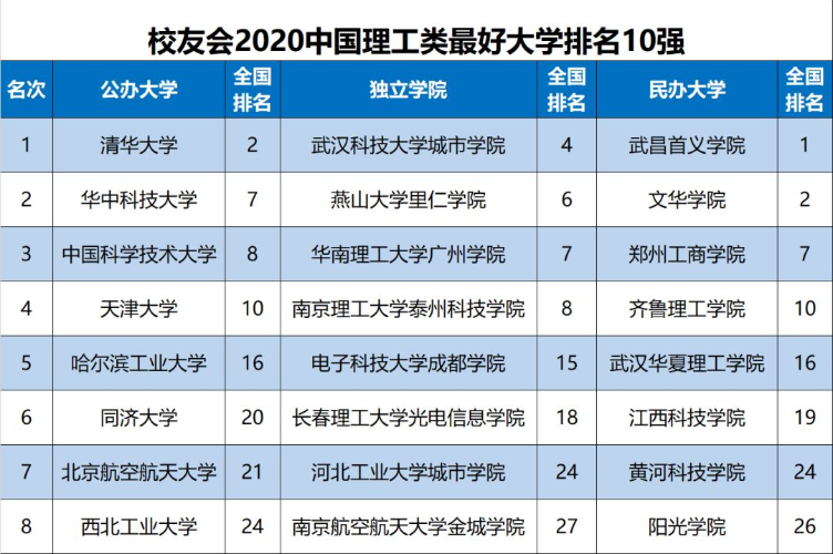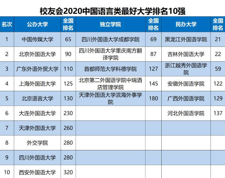 山東英才學(xué)院、武昌首義學(xué)院、西安歐亞學(xué)院、山東協(xié)和學(xué)院、黑龍江外國語學(xué)院、河北傳媒學(xué)院等分列校友會2020中國綜合類、理工類、財經(jīng)類、醫(yī)藥類、語言類和藝術(shù)類最好民辦大學(xué)排名榜榜首。