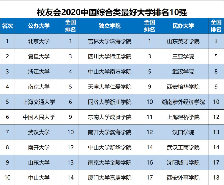 校友會2020年中國各類型大學(xué)排名發(fā)布,最新發(fā)布2020中國各類型最好大學(xué)排名,北京大學(xué)、清華大學(xué)和中南財經(jīng)政法大學(xué)等勇奪第一。