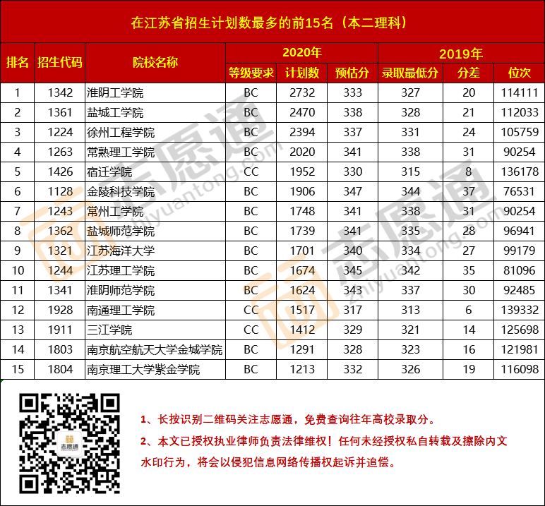 在此,江蘇招生考試網(wǎng)小編為大家整理了“2020年在江蘇省本二批招生計(jì)劃數(shù)最多的15所院校+今年預(yù)估分”,預(yù)估分來源于志愿通多名志愿填報(bào)專家研究得出,僅供大家參考。
