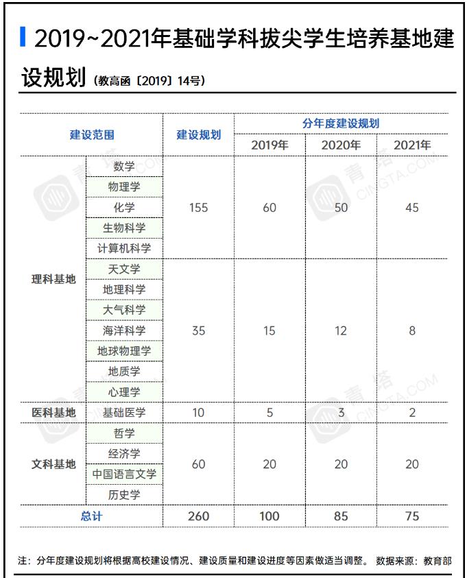 根據(jù)教育部2019年發(fā)布的文件,2019~2021年,將遴選建設(shè)260個(gè)基礎(chǔ)學(xué)科拔尖學(xué)生培養(yǎng)基地,包括190個(gè)左右的理科基地、60個(gè)左右的文科基地以及10個(gè)左右的醫(yī)科基地。