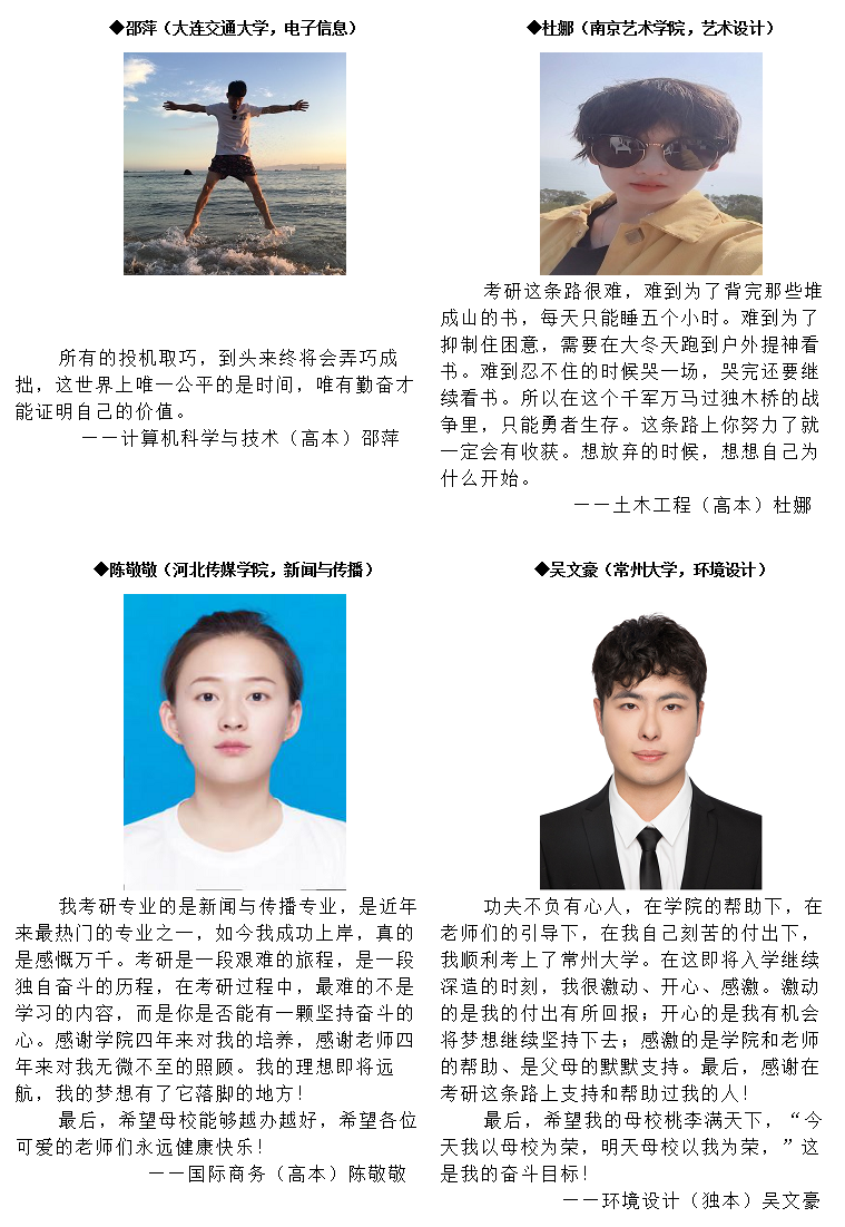 2021年這不僅是同學(xué)們寒窗苦讀、揮灑辛勤汗水的結(jié)果,也是學(xué)院高度重視考研工作的直接體現(xiàn)。學(xué)院一直以來(lái)十分注重提高學(xué)生的專業(yè)素質(zhì)和職業(yè)能力,堅(jiān)持考研與就業(yè)相統(tǒng)一的思想,鼓勵(lì)學(xué)生考研繼續(xù)深造。學(xué)院專門(mén)組建考研聯(lián)盟,加大對(duì)學(xué)生考研的動(dòng)員和輔導(dǎo),定期舉辦考研知識(shí)普及講座、考研學(xué)生經(jīng)驗(yàn)交流會(huì)等,對(duì)考研學(xué)生進(jìn)行院校專業(yè)選擇、考研復(fù)習(xí)、報(bào)名指導(dǎo)等全方位指導(dǎo),并通過(guò)相關(guān)教師、輔導(dǎo)員與考研學(xué)生進(jìn)行日常交流,將考研服務(wù)貫穿備考全過(guò)程。
