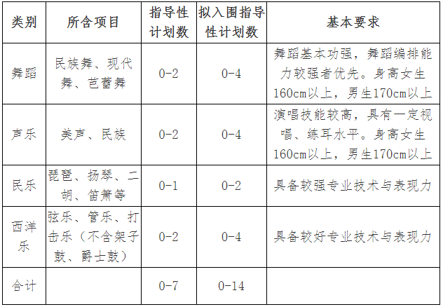 招生計劃7人,分項目指導性計劃數(shù)及科類要求如下表。各項目具體招生人數(shù),將根據考生報考情況、專業(yè)水平及學校藝術團建設需要進行適當調整,擇優(yōu)錄取,寧缺毋濫。