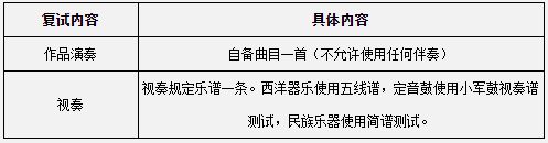 復(fù)試內(nèi)容包括作品演奏和視奏兩個方面。作品演奏時間不超過3分鐘,視奏時間不超過2分鐘。