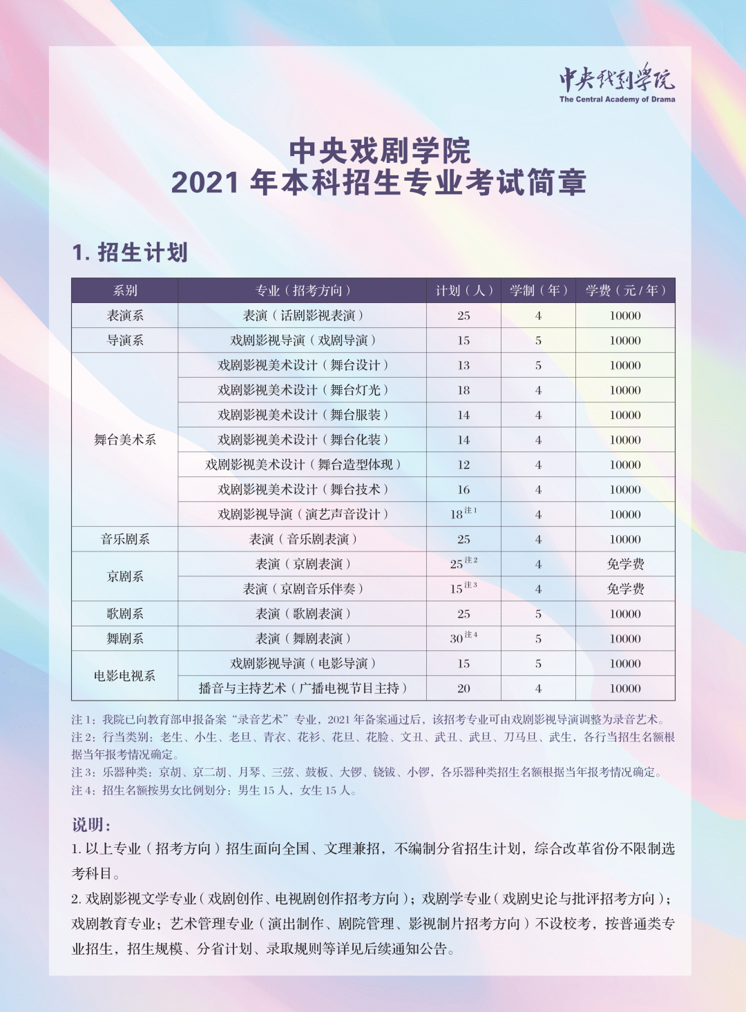 中央戲劇學(xué)院發(fā)布2021年本科招生簡(jiǎn)章,戲劇影視文學(xué)(戲劇創(chuàng)作、電視劇創(chuàng)作招考方向);戲劇學(xué)方向(戲劇史論與批判招考方向);戲劇教育專業(yè);藝術(shù)管理專業(yè)(演出制作、劇院管理、影視制片招考方向)不設(shè)???,按普通類專業(yè)招生。
