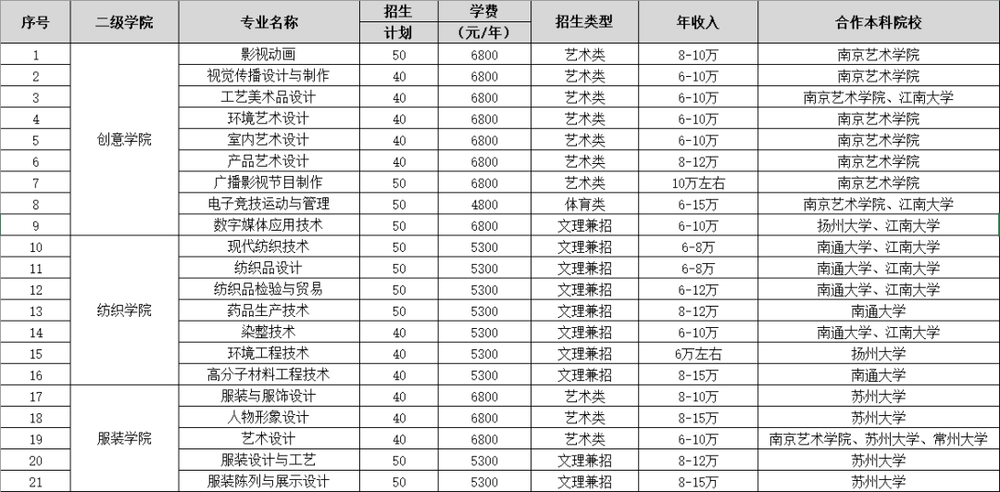 備注:最終招生專業(yè)及計劃以江蘇省教育廳公布數(shù)據(jù)為準。會計(中外合作辦學)專業(yè)學費12000元/年,錄取后學生將獲得我校提供的助學金6000元/年,實際學費按6000元/年收取。