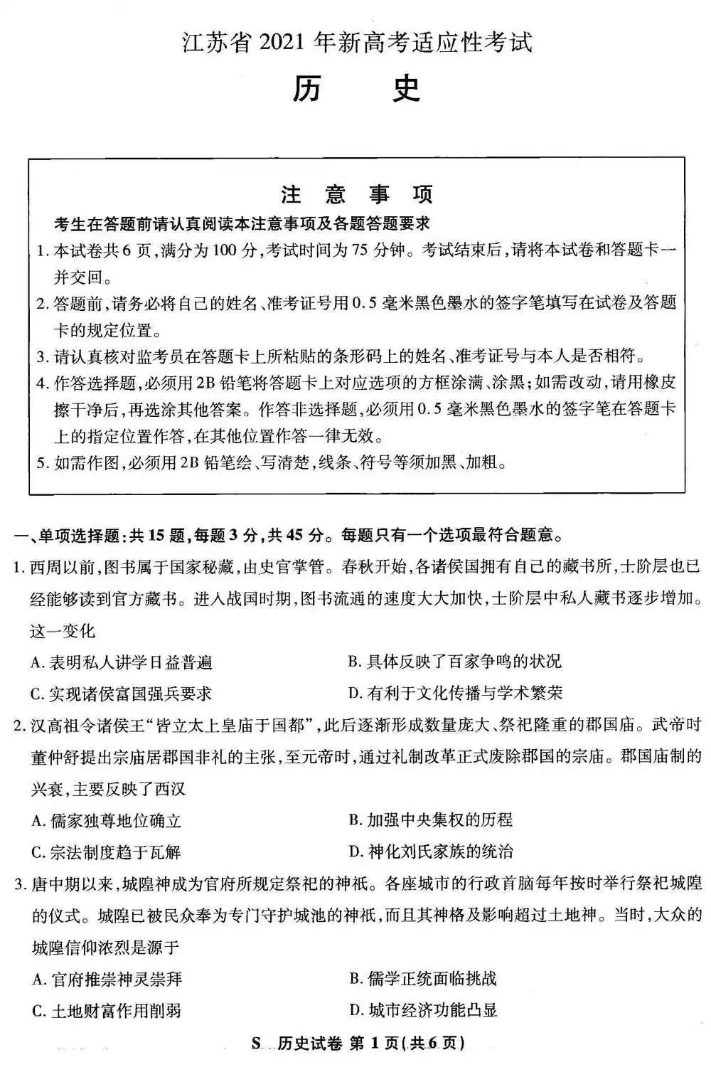 【歷史】江蘇省2021年普通高等學校招生全國統(tǒng)一考試模擬演練歷史試題