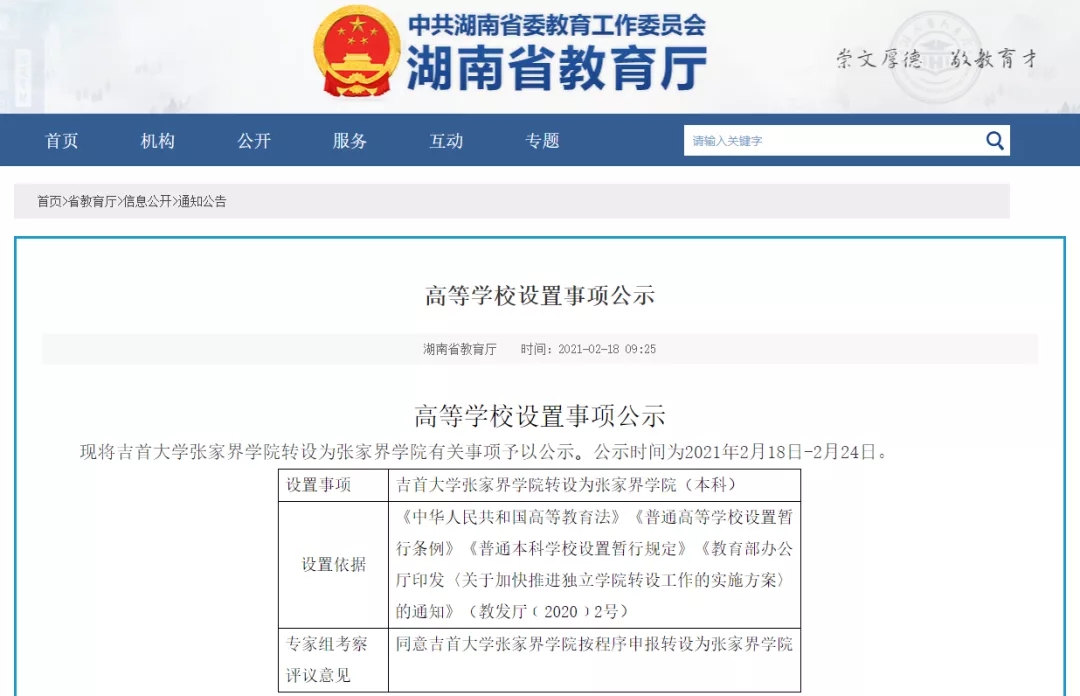 2月18日,湖南省教育廳發(fā)布一則《高等學(xué)校設(shè)置事項公示》,將吉首大學(xué)張家界學(xué)院轉(zhuǎn)設(shè)為張家界學(xué)院(本科)有關(guān)事項予以公示。