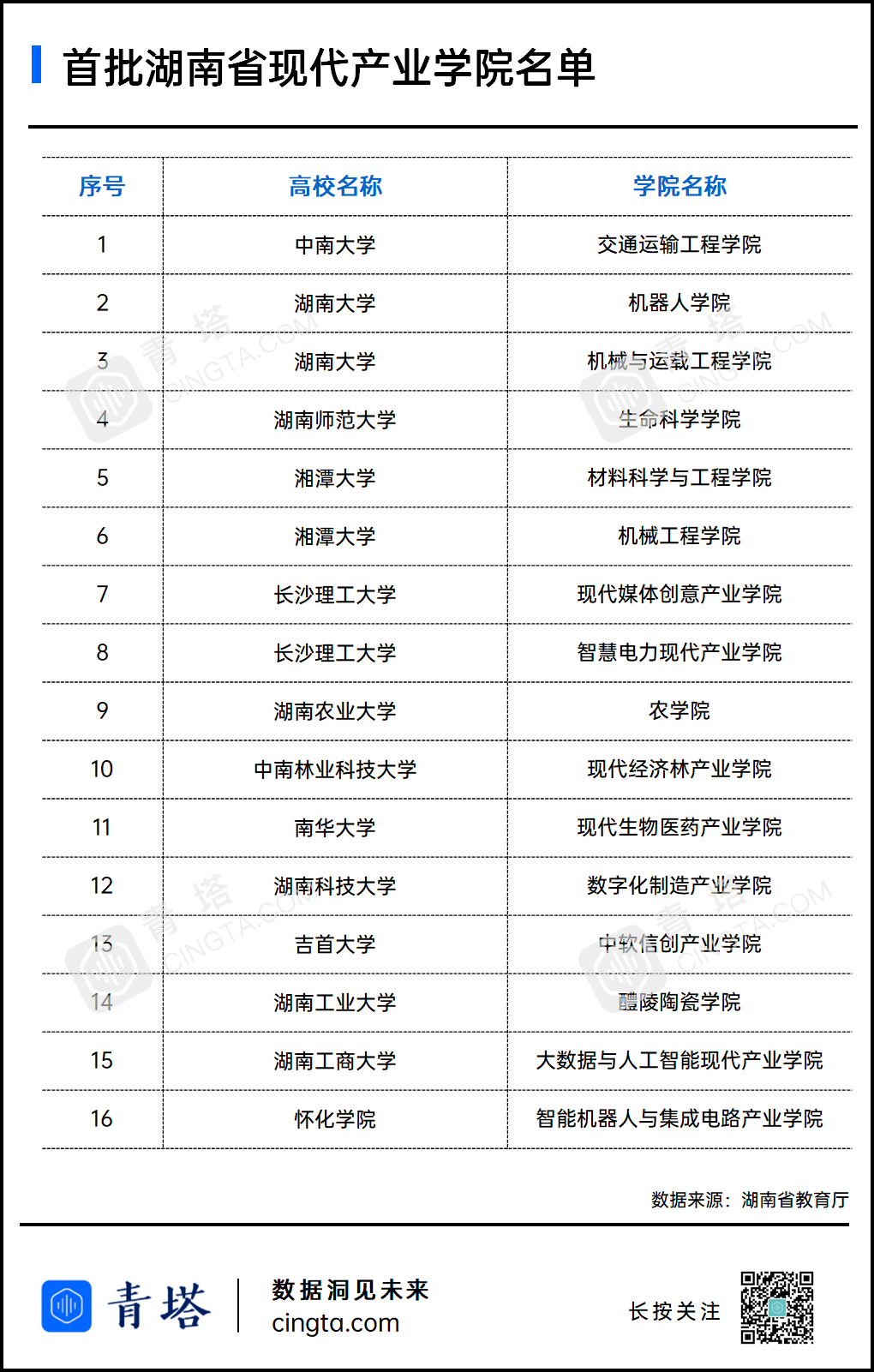 為貫徹國家有關(guān)戰(zhàn)略和湖南省“三高四新”戰(zhàn)略要求,湖南省于2020年年底啟動首批現(xiàn)代產(chǎn)業(yè)學院申報與建設工作。首批入選的16個產(chǎn)業(yè)學院涵蓋新工科、新醫(yī)科、新農(nóng)科、新文科領域,重點支持機器人、智能制造、航空航天、生物醫(yī)藥、新材料等,具有育人成效顯著、區(qū)域產(chǎn)業(yè)特色鮮明、產(chǎn)學研用聯(lián)動深入等引領示范作用。