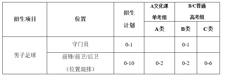 2021年符合我校男子足球項(xiàng)目的報(bào)考資格的考生,專業(yè)測(cè)試需參加全國(guó)統(tǒng)考,我校不再組織該項(xiàng)目的校考。