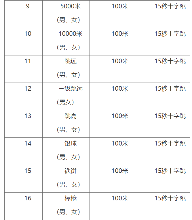 2.女子田徑13人。招生項(xiàng)目小項(xiàng)包括100米、200米、400米、400米欄、100米欄、800米、1500米、5000米、10000米、跳遠(yuǎn)、三級(jí)跳遠(yuǎn)、跳高、鉛球、鐵餅、標(biāo)槍。
