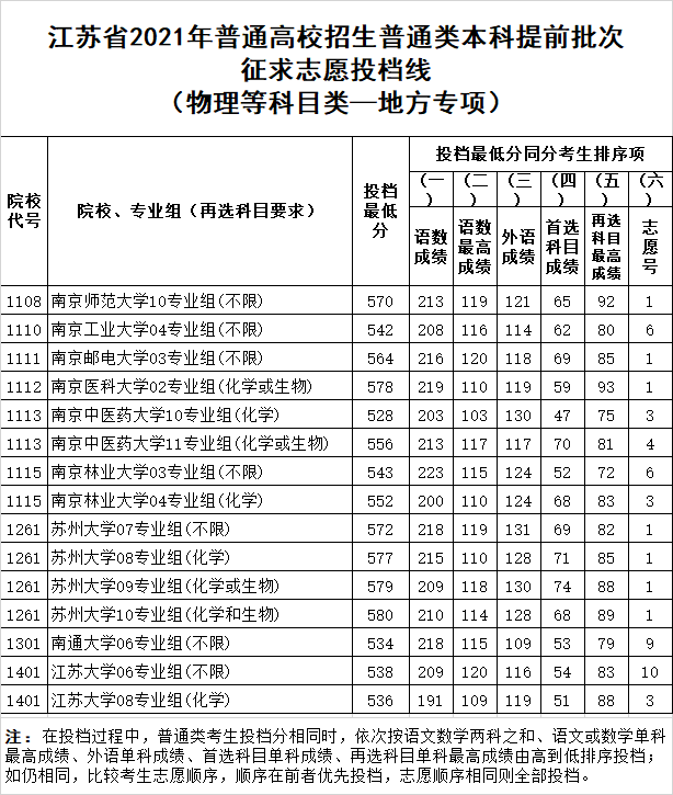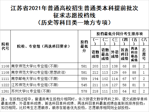 江蘇省2021年普通類本科提前批次征求志愿投檔線(地方專項(xiàng)計(jì)劃)