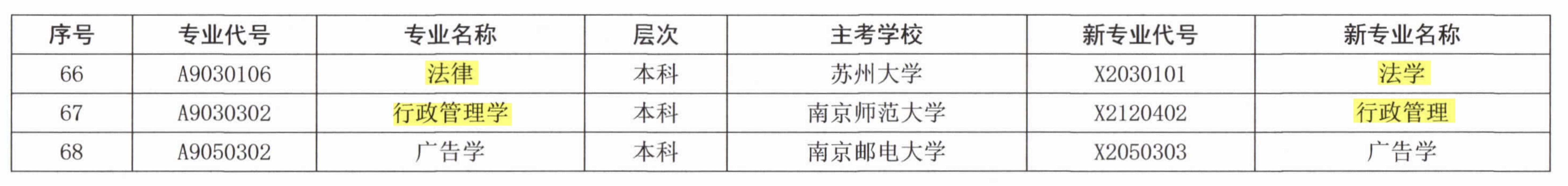 注:圖片為代碼發(fā)生改變的專業(yè),標(biāo)黃部分為改名的專業(yè)