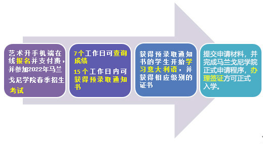 2022年2月下旬,馬蘭戈尼學(xué)院將以藝術(shù)升為官方報名平臺,在中國區(qū)舉辦專業(yè)預(yù)選錄取考試,通過考試的學(xué)生可獲得優(yōu)先預(yù)錄取資格。獲取優(yōu)先錄取資格的學(xué)生需進行意大利語學(xué)習(xí),達到所申請專業(yè)的語言要求,換取正式的錄取通知書。