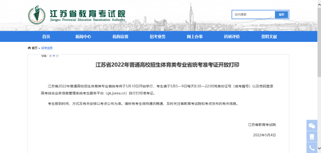 江蘇省教育考試院昨日發(fā)布了關(guān)于2022年普通高校招生體育類專業(yè)省統(tǒng)考準(zhǔn)考證開放打印的通知,內(nèi)容如下: