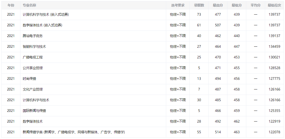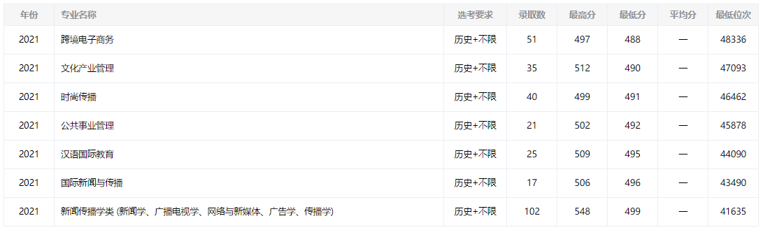2 2022年南京傳媒學院錄取分數(shù)線及位次● 由于2022年南京傳媒學院錄取分數(shù)線還未公布,各位考生和家長可以參考往年的南京傳媒學院專業(yè)錄取分數(shù)線和位次,同時也可以添加江蘇升學指導中心志愿填報指導老師咨詢。 3 南京傳媒學院專業(yè)錄取情況● 1.物理(2021年) 2.歷史(2021年)