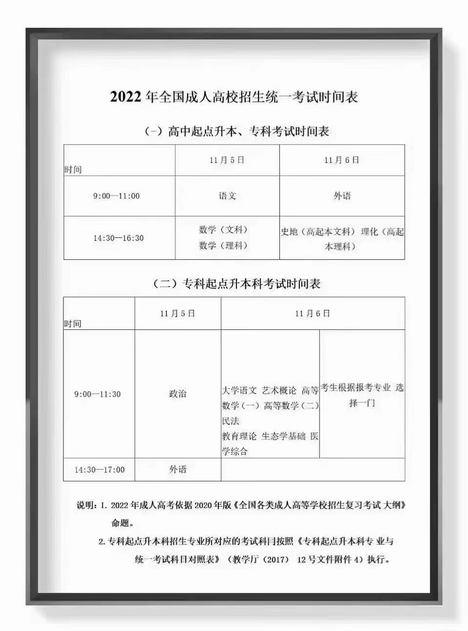 2022年成考考試時間延期至11月5-6號,具體時間如圖: