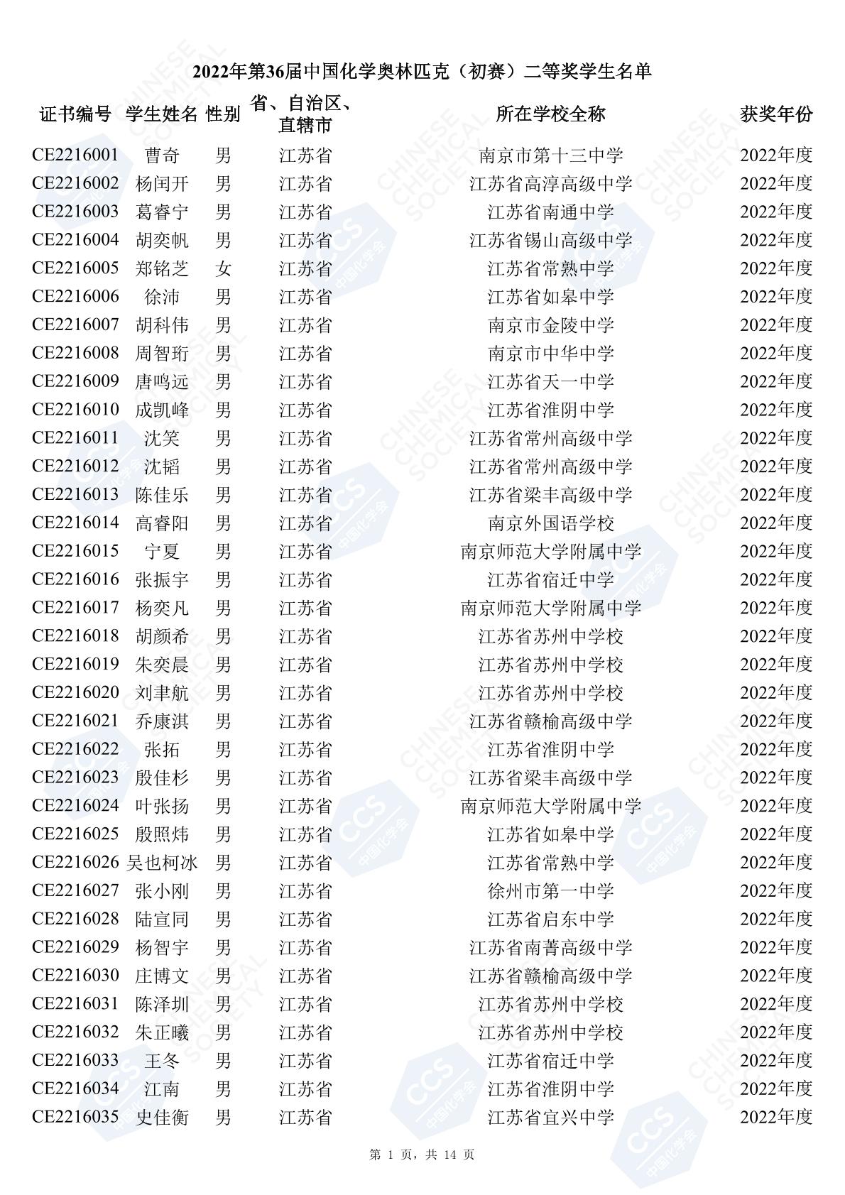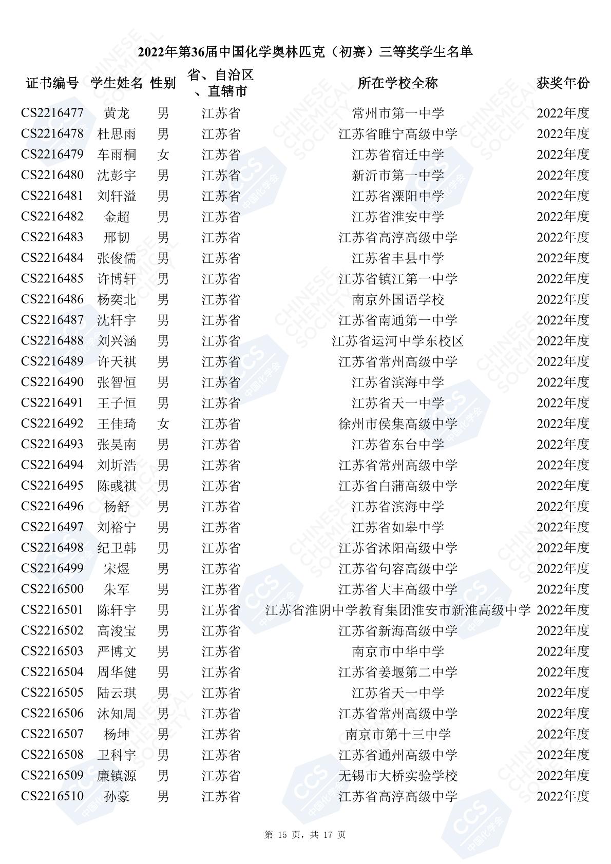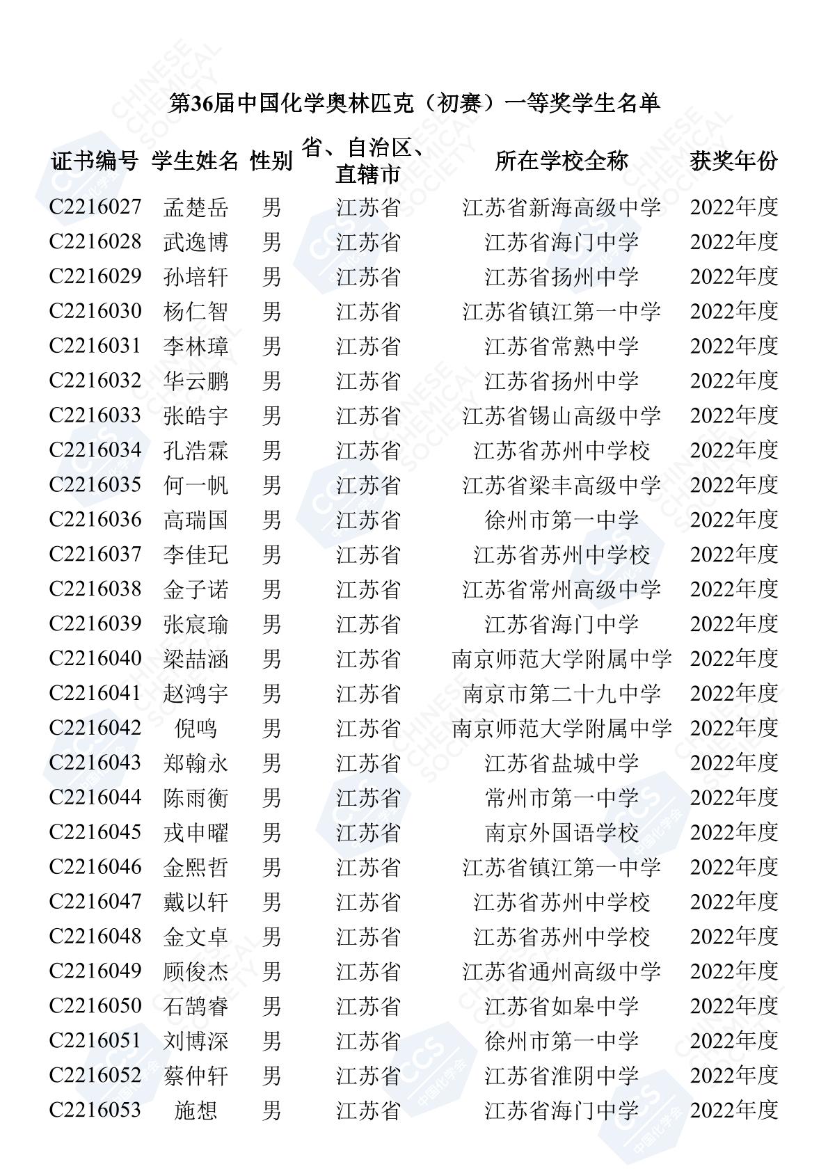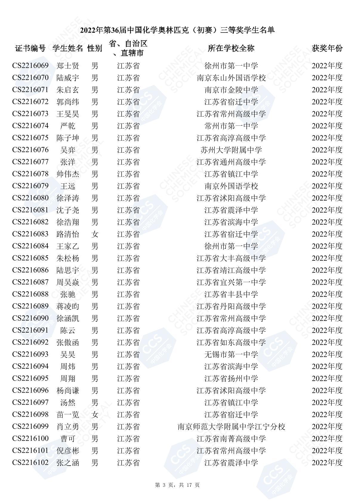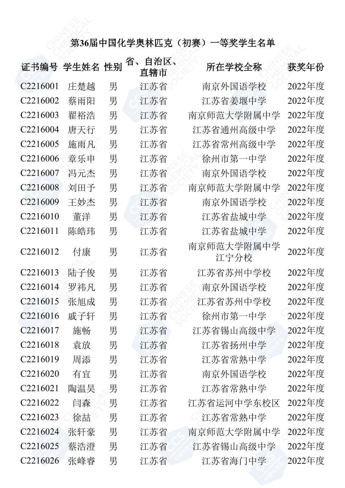 11月3日,中國化學(xué)會(huì)正式公布了2022年第36屆中國化學(xué)奧林匹克初賽省一、省二、省三獲獎(jiǎng)名單。今天江蘇招生考試網(wǎng)為大家?guī)砹私K省的獲獎(jiǎng)名單,此次共有102人獲得了省一獎(jiǎng)項(xiàng)。讓我們一起恭喜獲獎(jiǎng)的同學(xué),來看看都是哪些學(xué)校的學(xué)霸獲得此獎(jiǎng)吧!