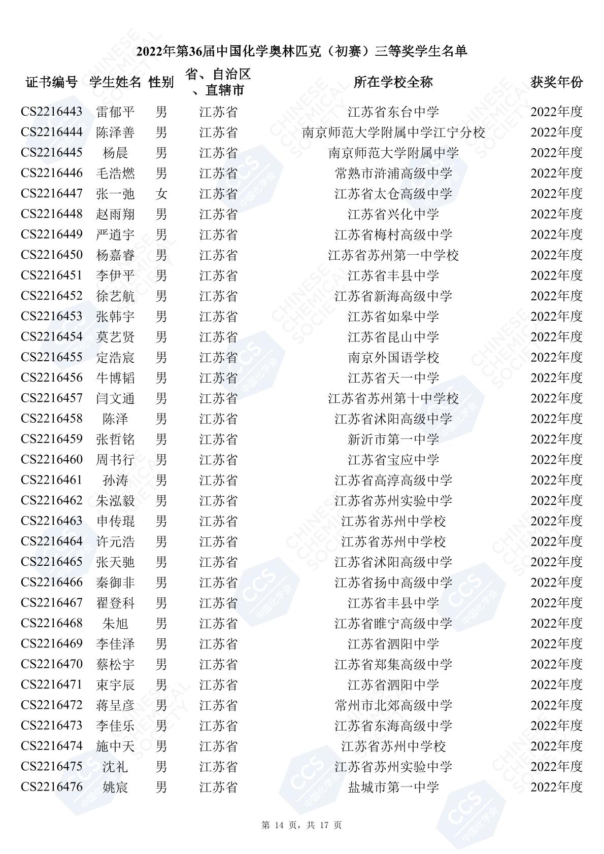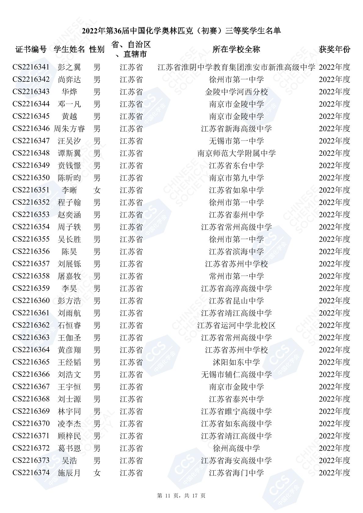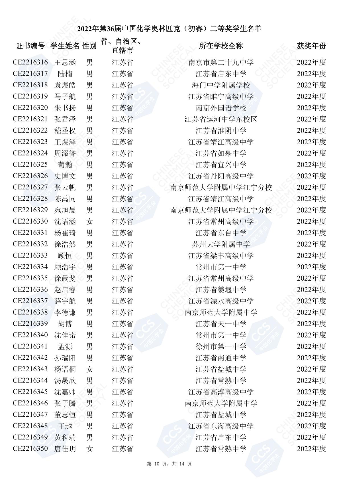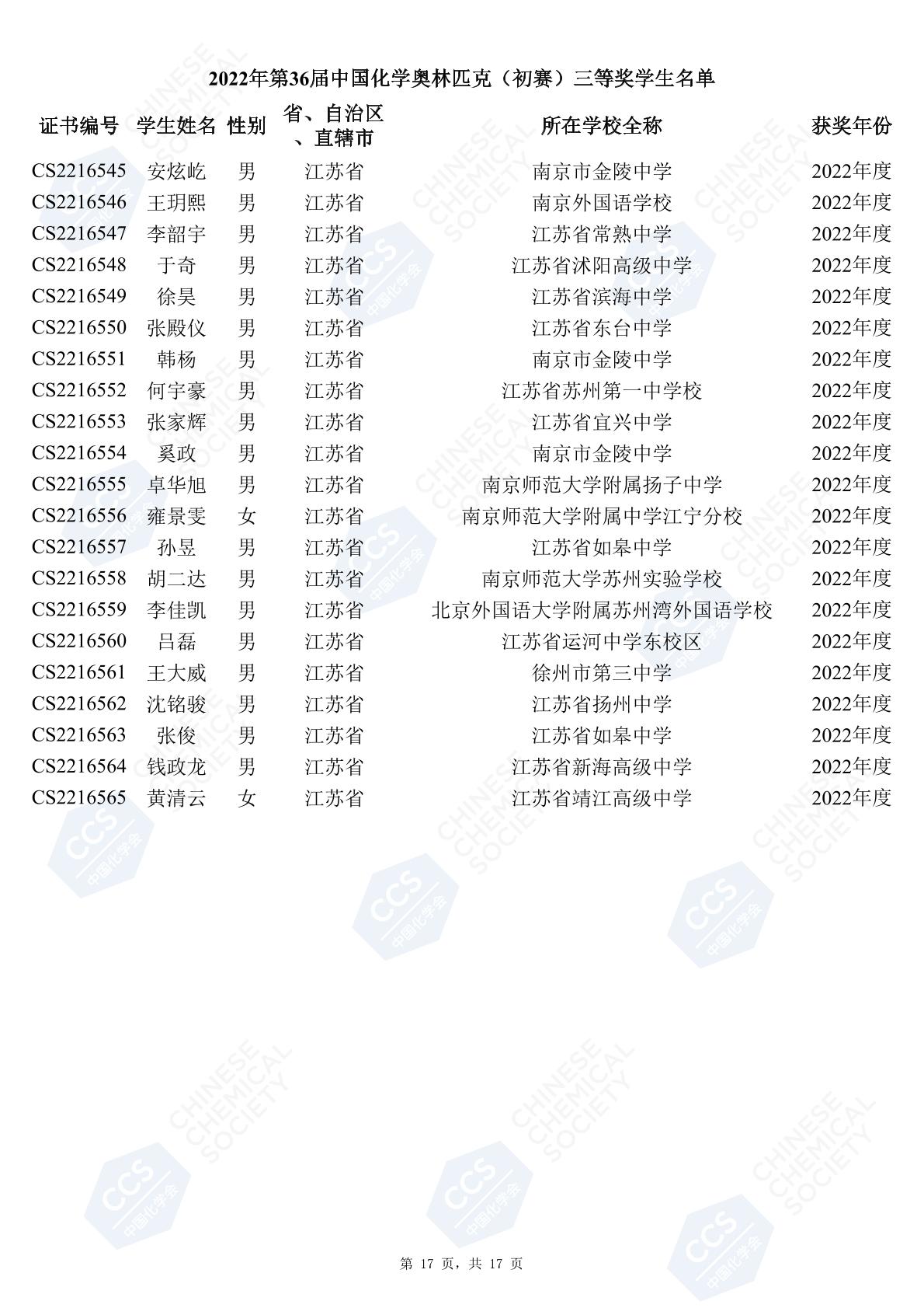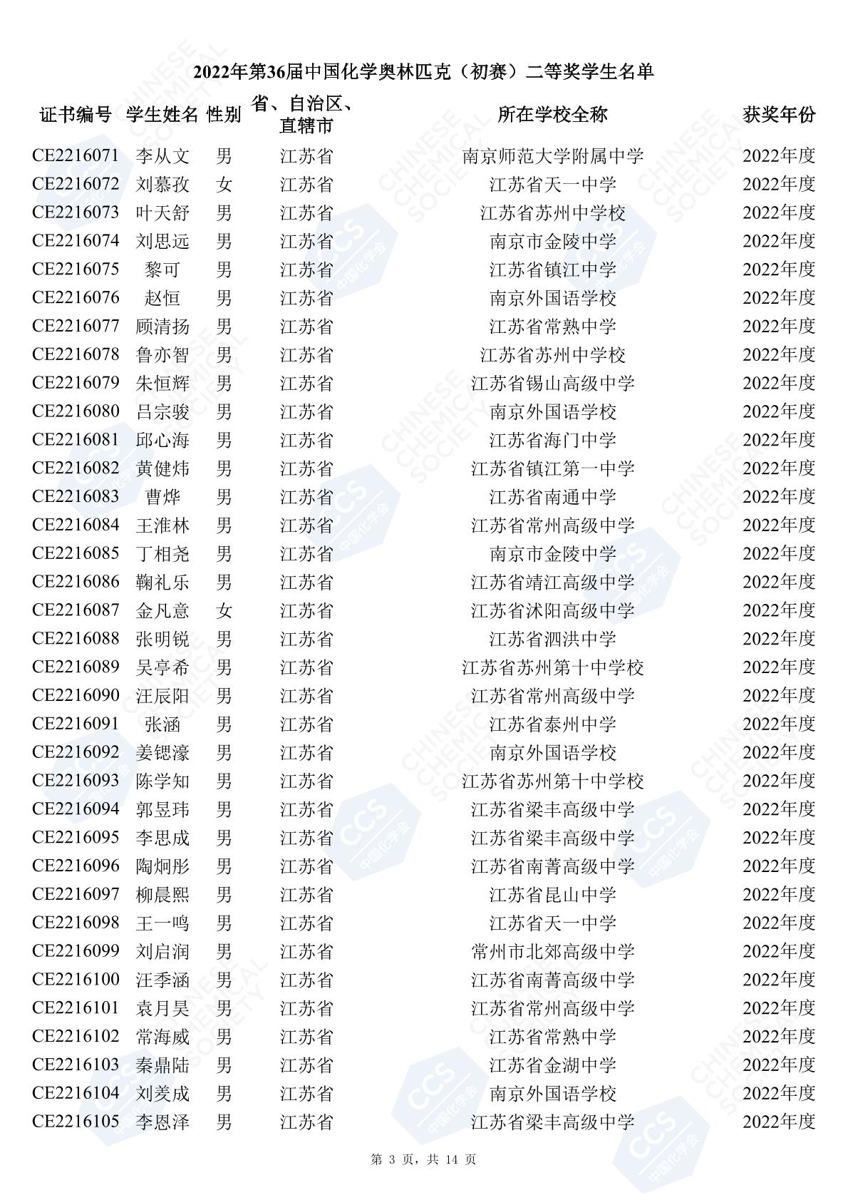 11月3日,中國化學(xué)會(huì)正式公布了2022年第36屆中國化學(xué)奧林匹克初賽省一、省二、省三獲獎(jiǎng)名單。今天江蘇招生考試網(wǎng)為大家?guī)砹私K省的獲獎(jiǎng)名單,此次共有102人獲得了省一獎(jiǎng)項(xiàng)。讓我們一起恭喜獲獎(jiǎng)的同學(xué),來看看都是哪些學(xué)校的學(xué)霸獲得此獎(jiǎng)吧!