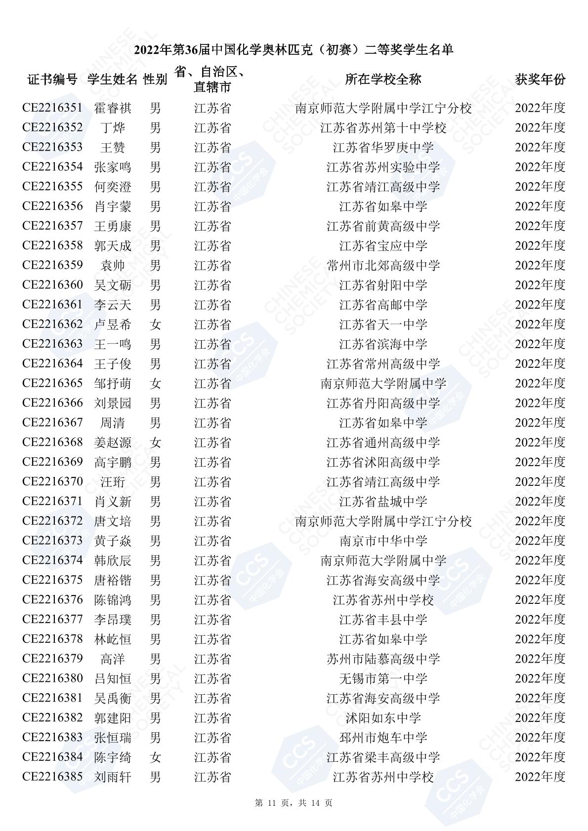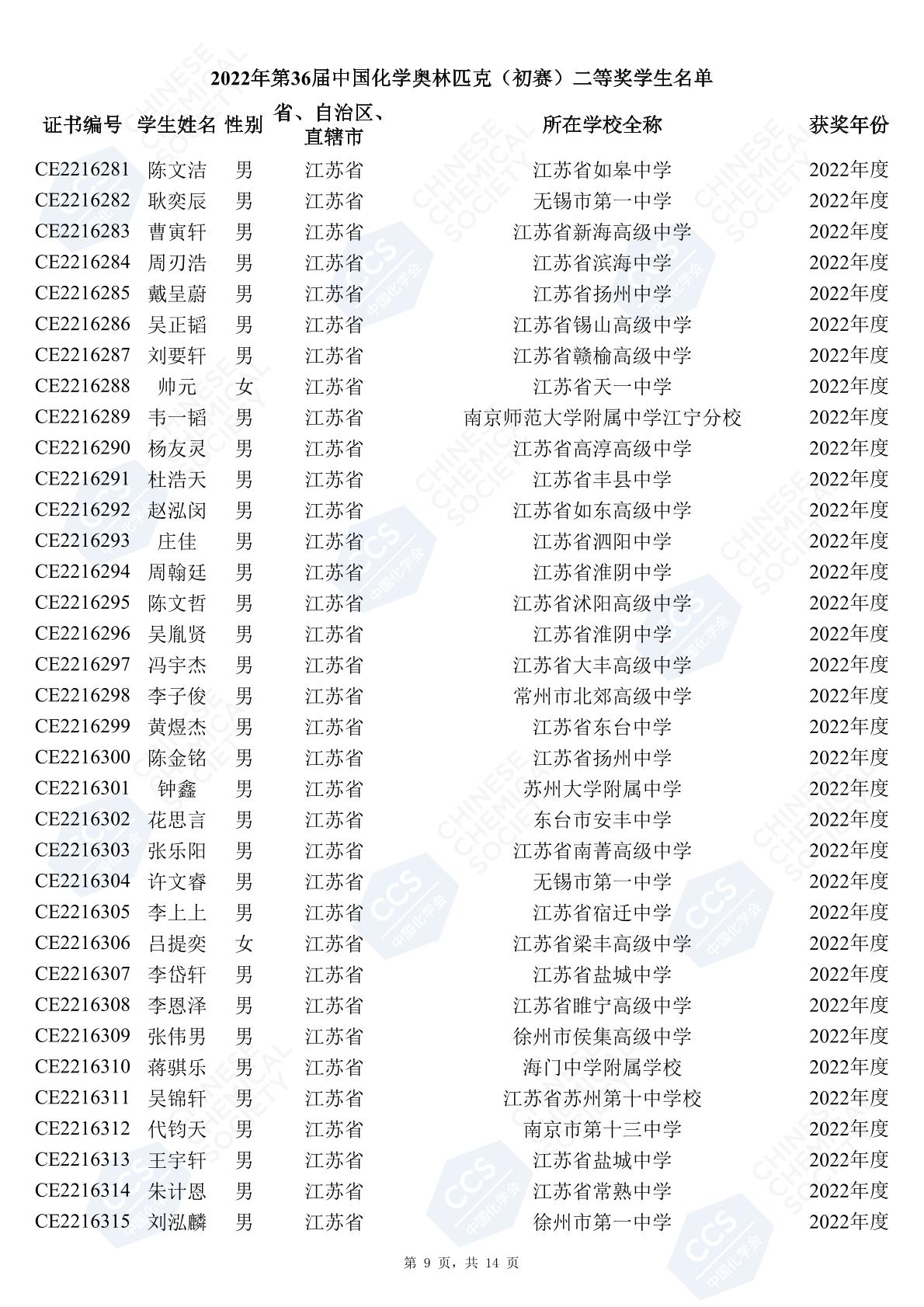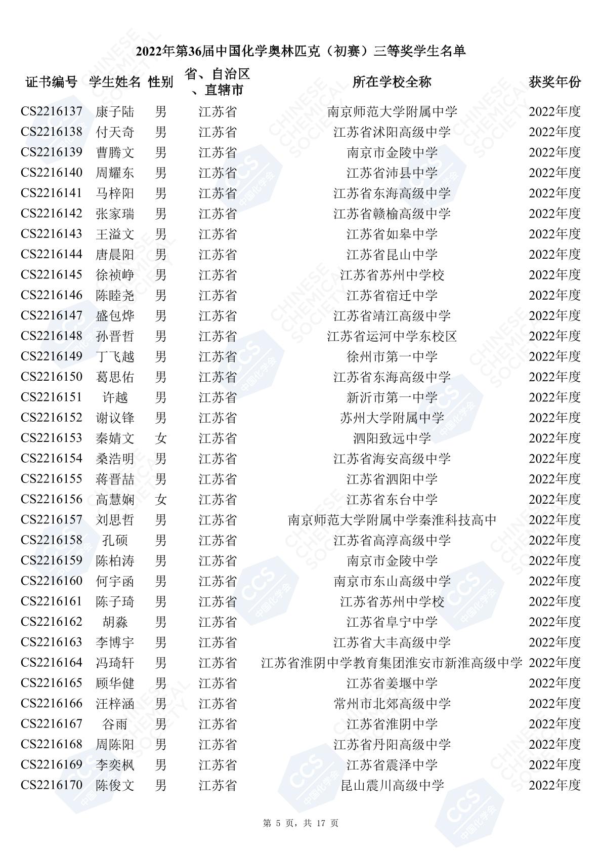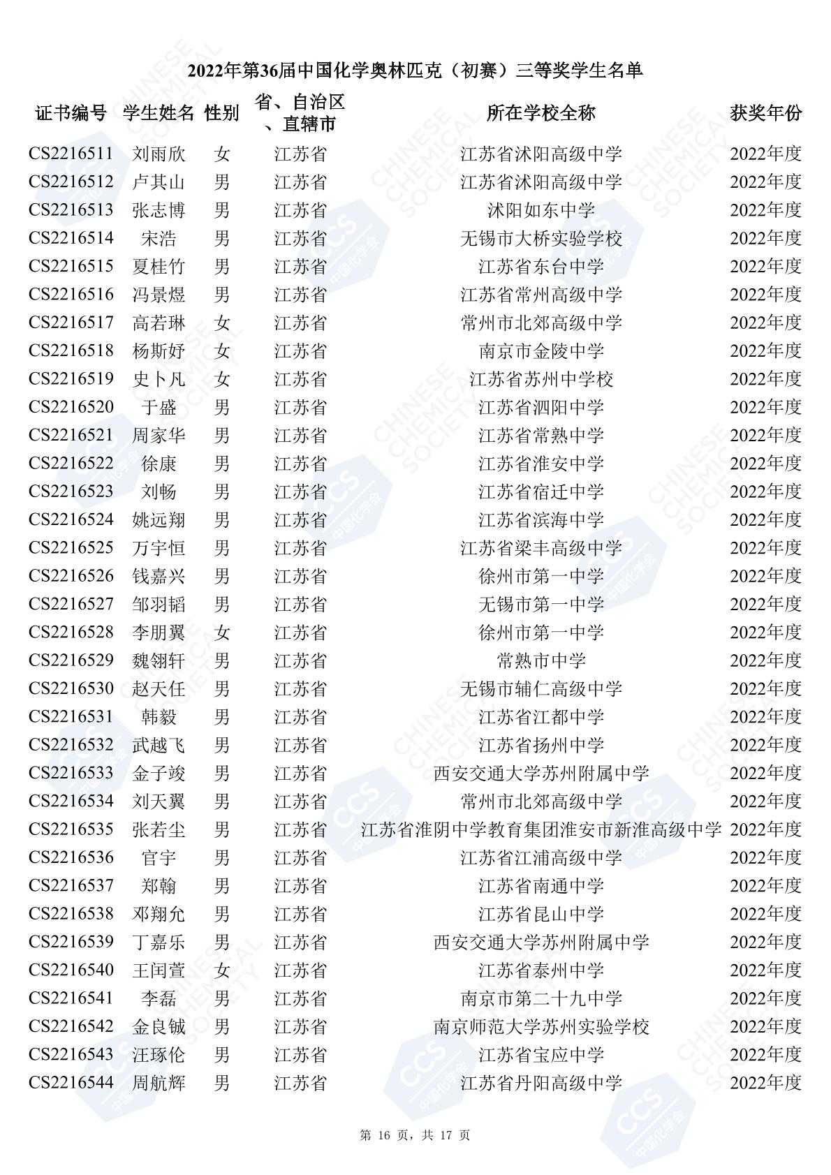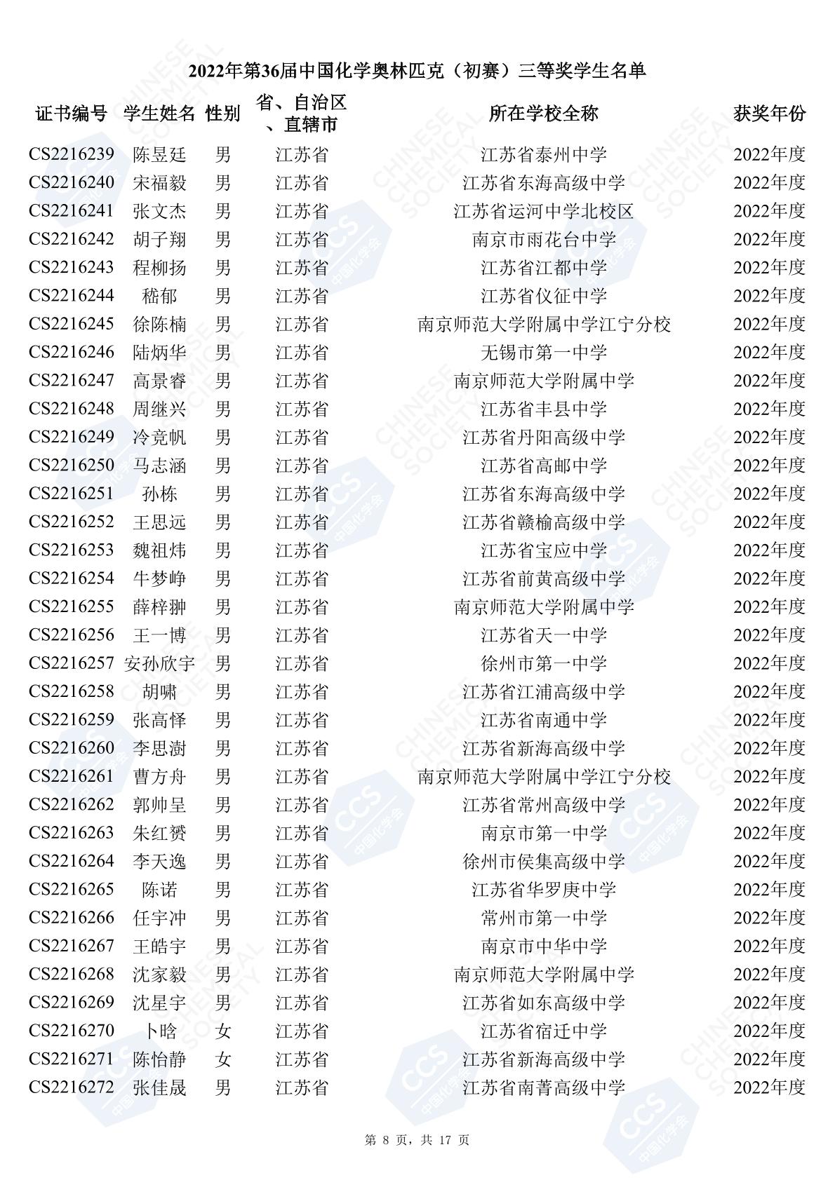11月3日,中國化學(xué)會(huì)正式公布了2022年第36屆中國化學(xué)奧林匹克初賽省一、省二、省三獲獎(jiǎng)名單。今天江蘇招生考試網(wǎng)為大家?guī)砹私K省的獲獎(jiǎng)名單,此次共有102人獲得了省一獎(jiǎng)項(xiàng)。讓我們一起恭喜獲獎(jiǎng)的同學(xué),來看看都是哪些學(xué)校的學(xué)霸獲得此獎(jiǎng)吧!