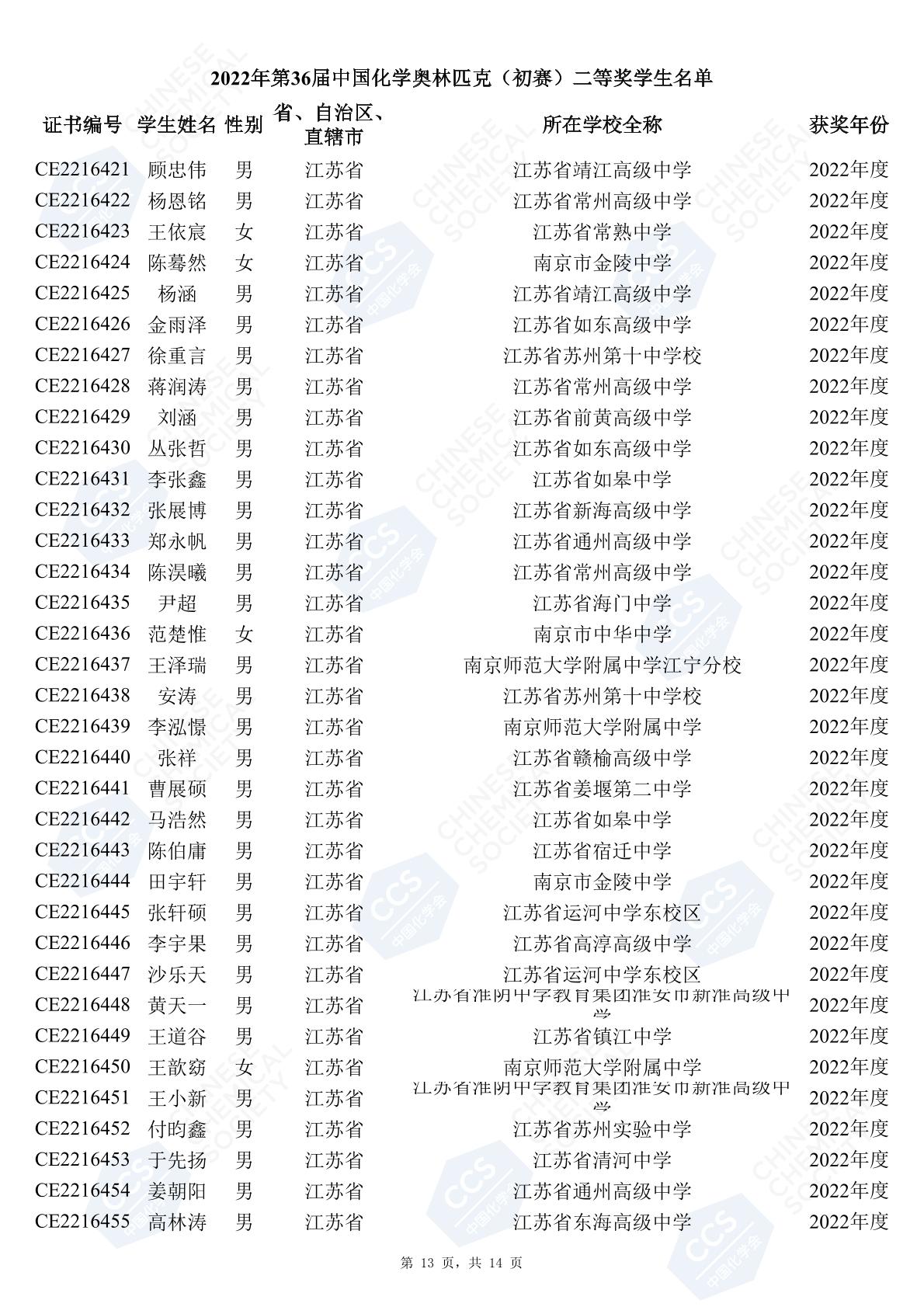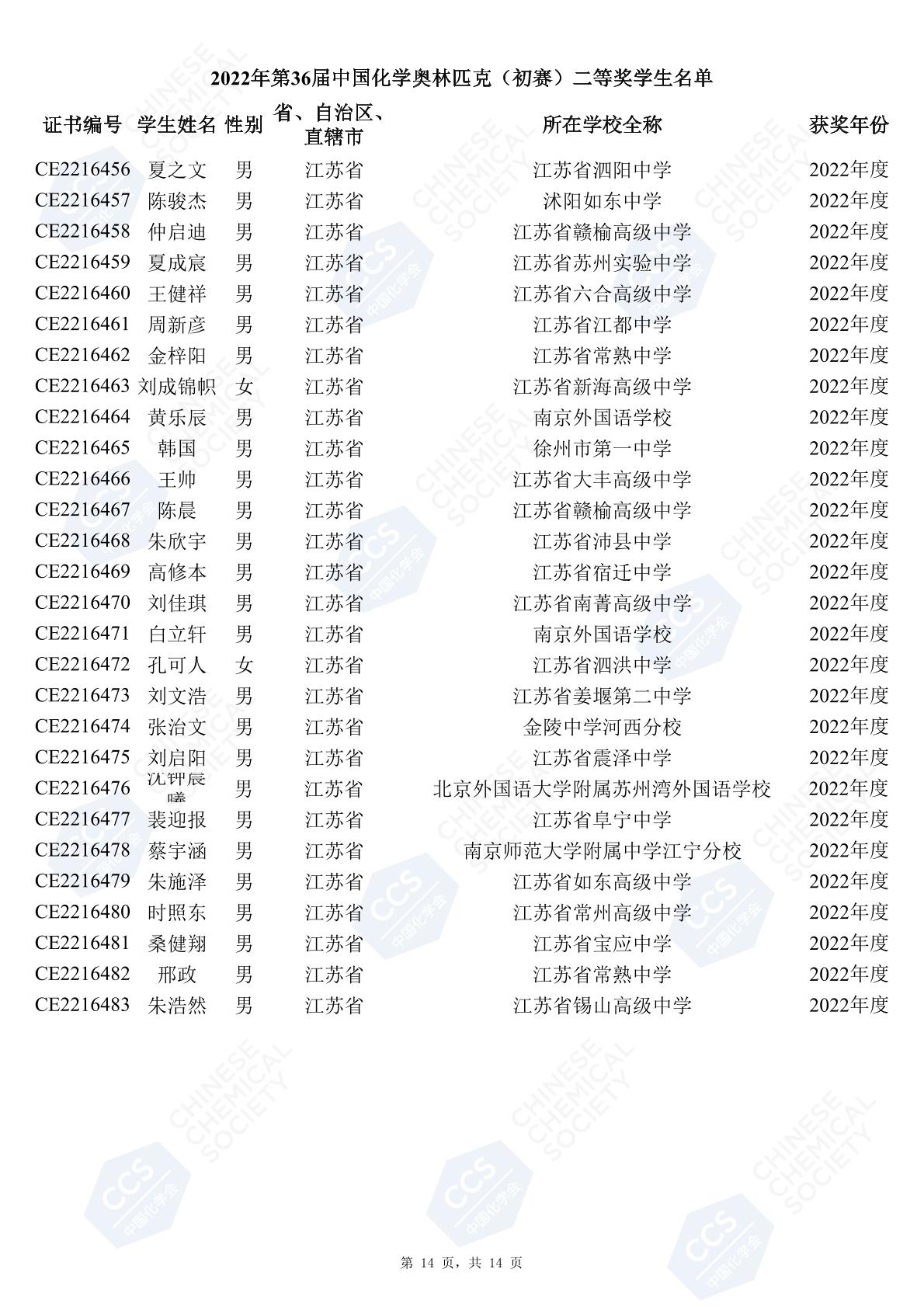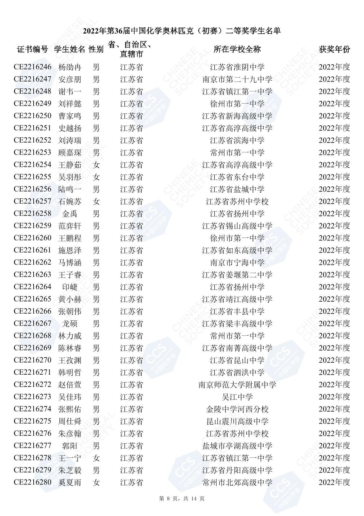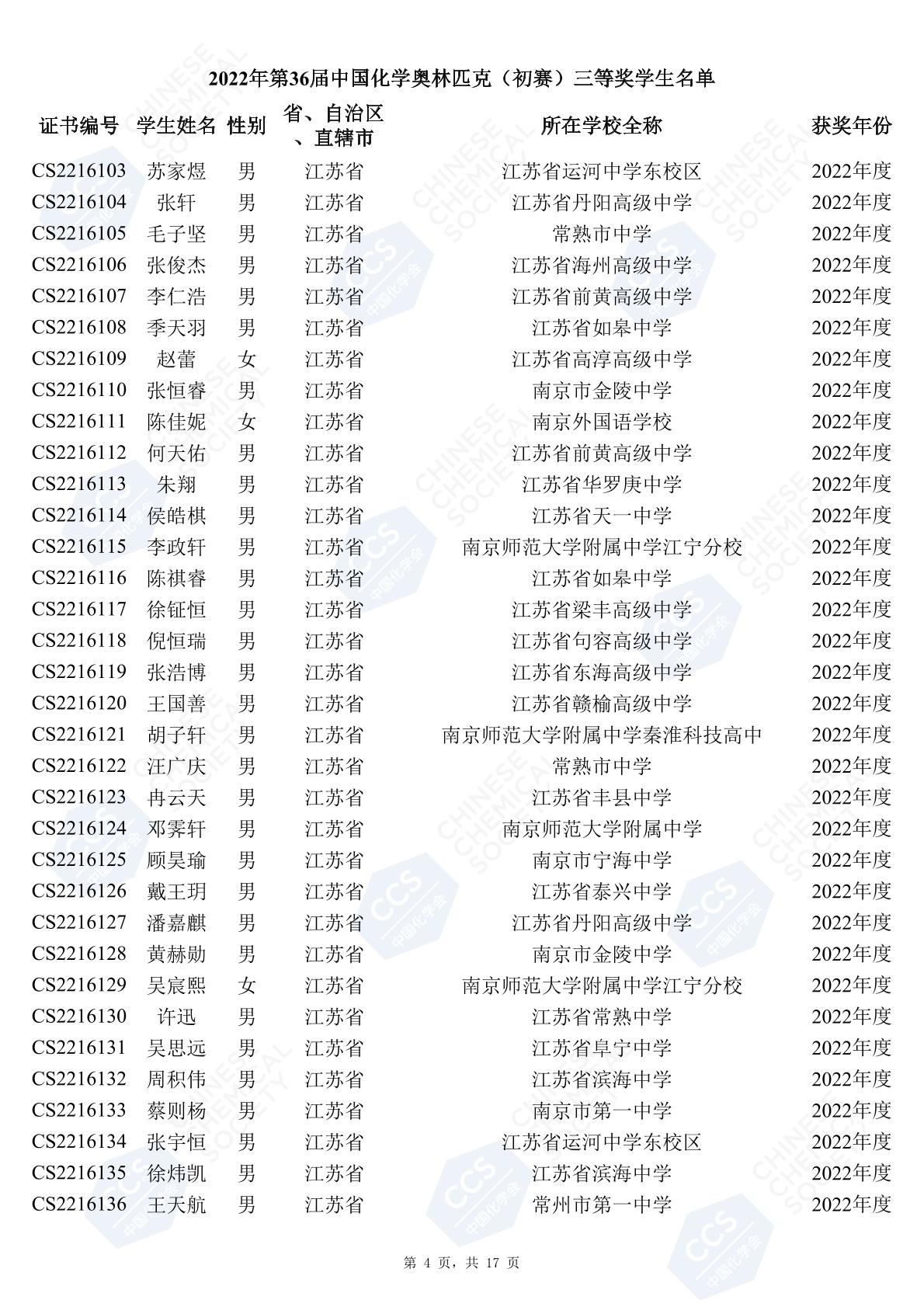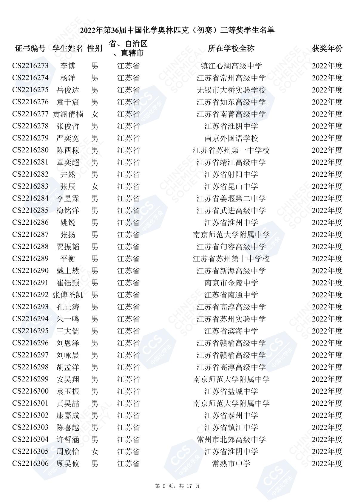 11月3日,中國化學(xué)會(huì)正式公布了2022年第36屆中國化學(xué)奧林匹克初賽省一、省二、省三獲獎(jiǎng)名單。今天江蘇招生考試網(wǎng)為大家?guī)砹私K省的獲獎(jiǎng)名單,此次共有102人獲得了省一獎(jiǎng)項(xiàng)。讓我們一起恭喜獲獎(jiǎng)的同學(xué),來看看都是哪些學(xué)校的學(xué)霸獲得此獎(jiǎng)吧!