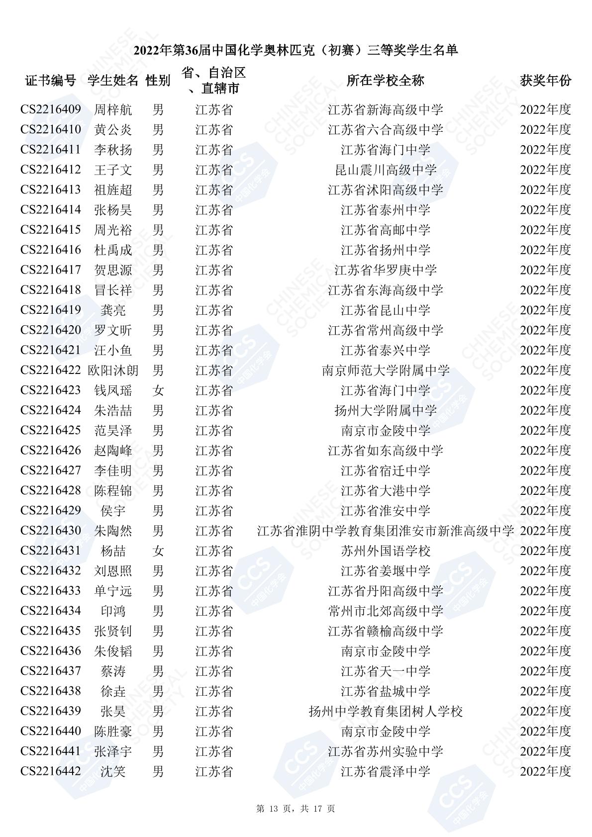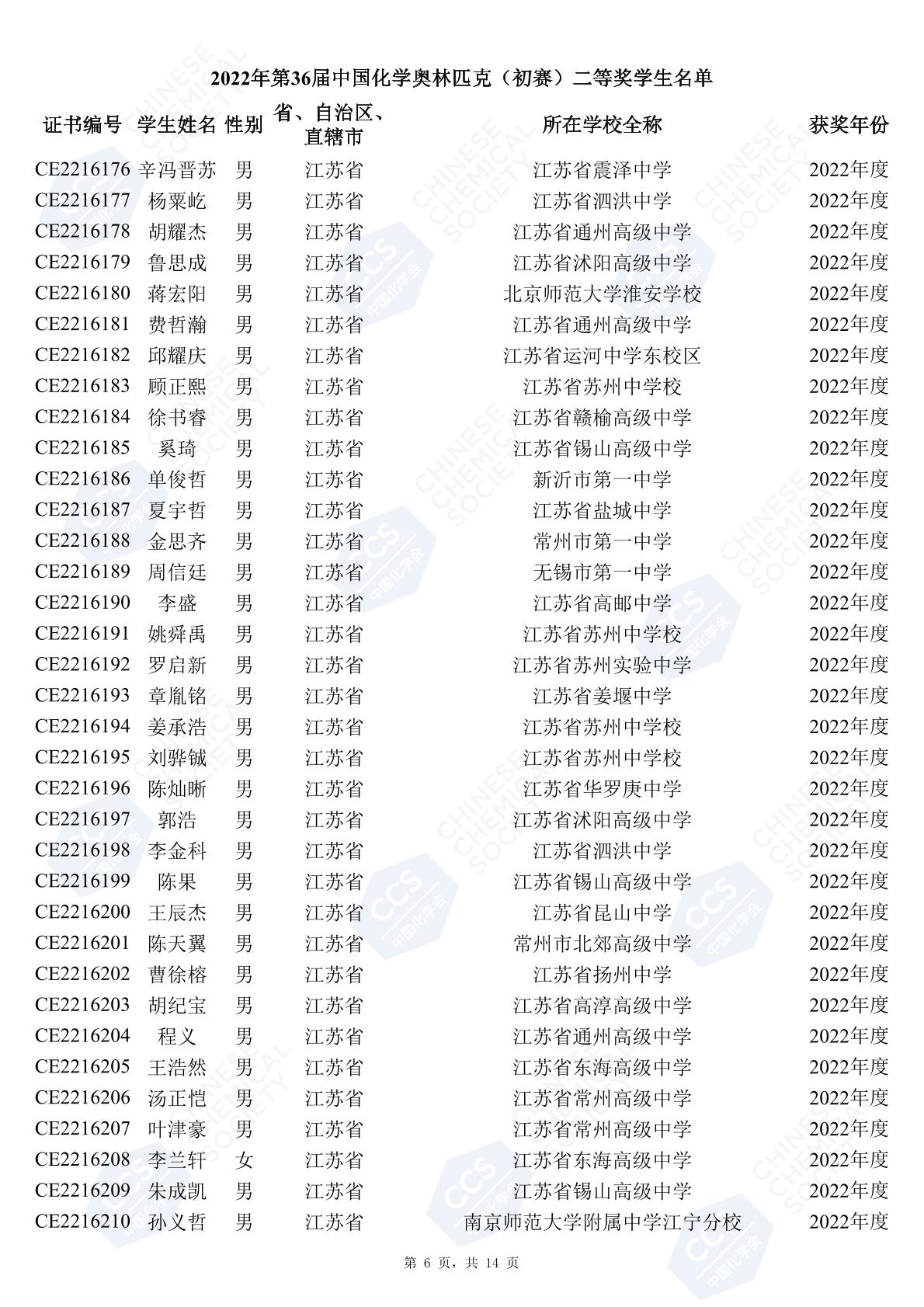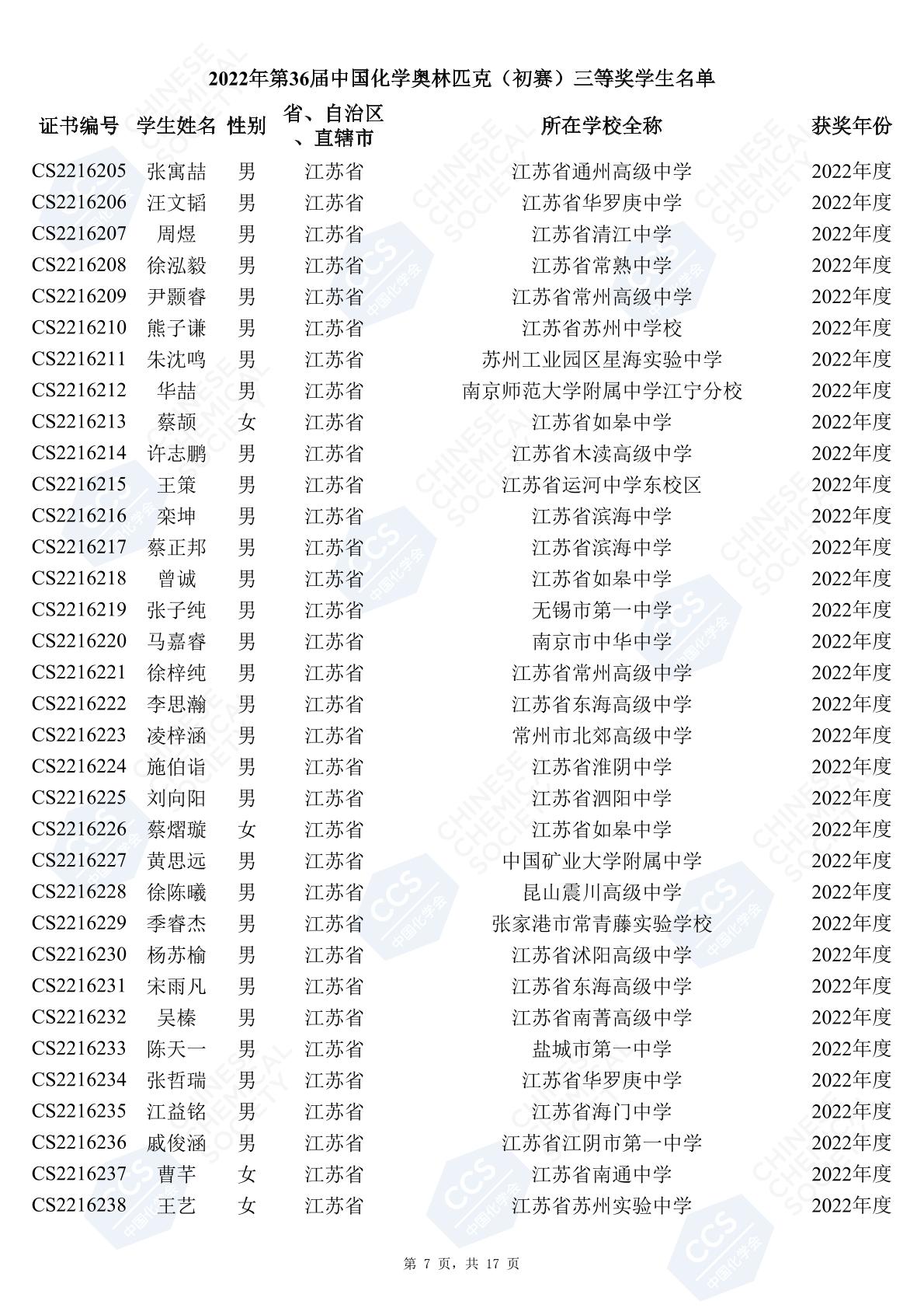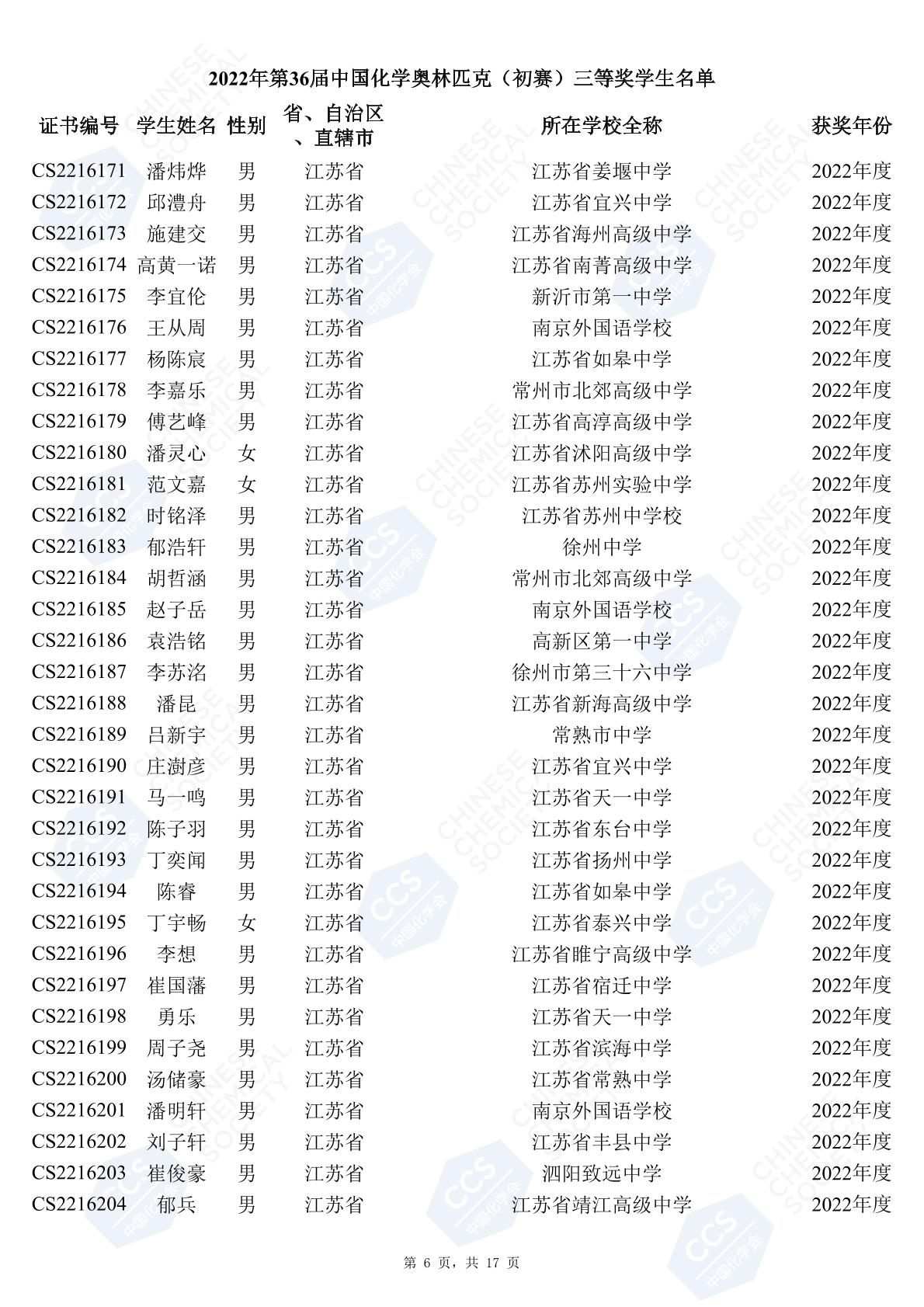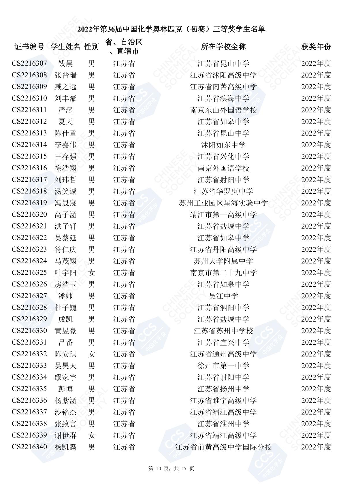 11月3日,中國化學(xué)會(huì)正式公布了2022年第36屆中國化學(xué)奧林匹克初賽省一、省二、省三獲獎(jiǎng)名單。今天江蘇招生考試網(wǎng)為大家?guī)砹私K省的獲獎(jiǎng)名單,此次共有102人獲得了省一獎(jiǎng)項(xiàng)。讓我們一起恭喜獲獎(jiǎng)的同學(xué),來看看都是哪些學(xué)校的學(xué)霸獲得此獎(jiǎng)吧!