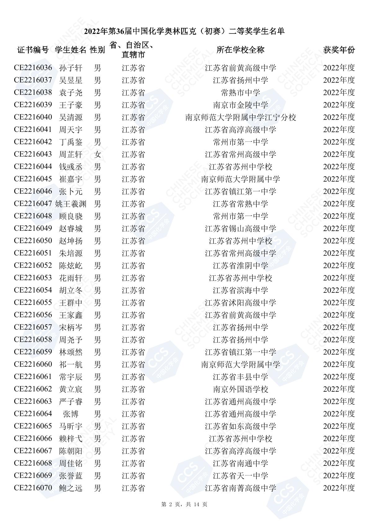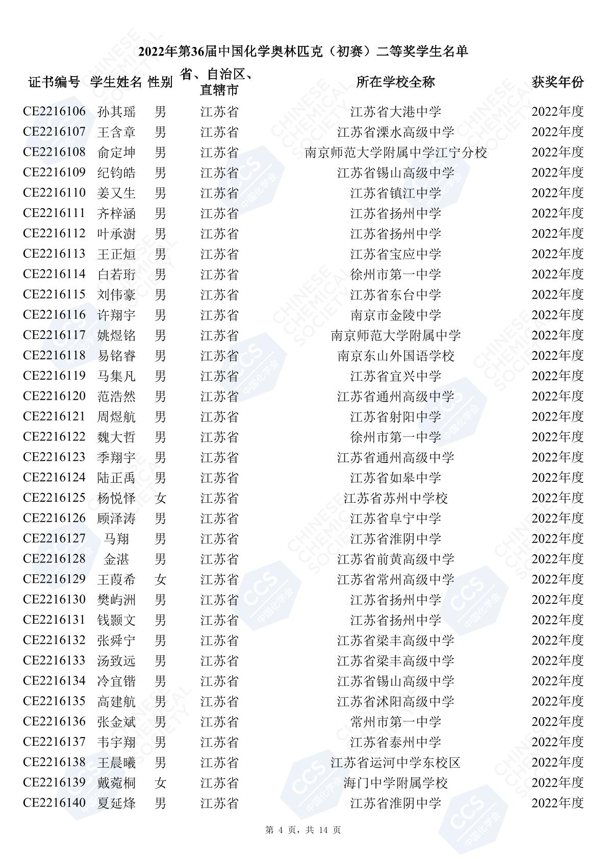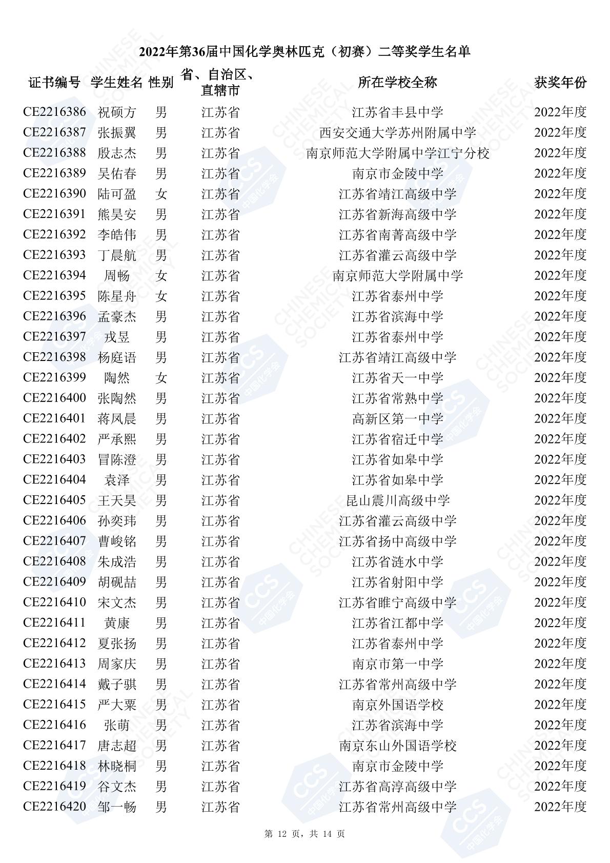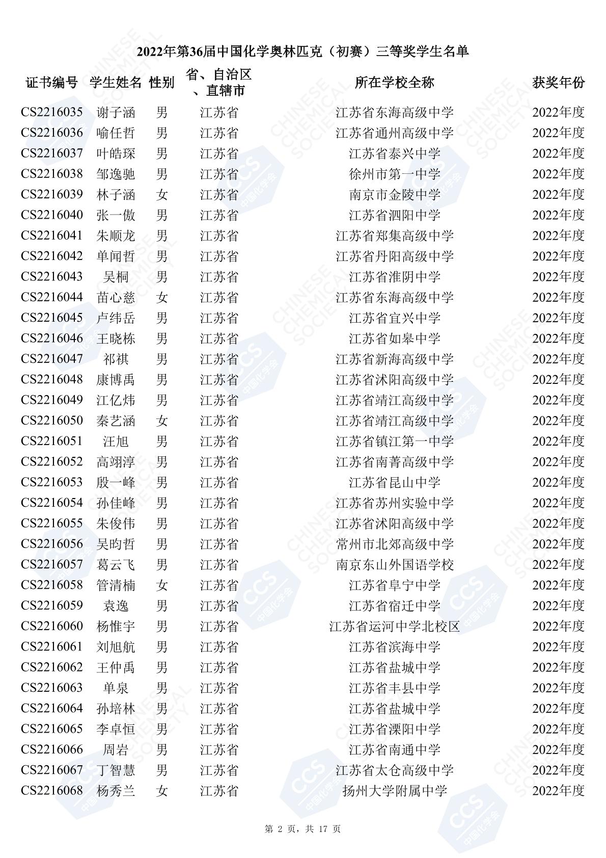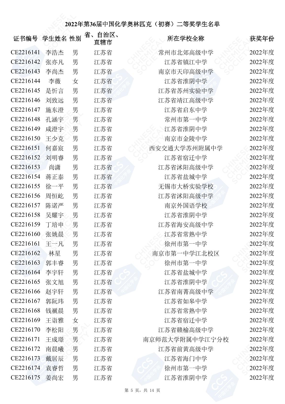 11月3日,中國化學(xué)會(huì)正式公布了2022年第36屆中國化學(xué)奧林匹克初賽省一、省二、省三獲獎(jiǎng)名單。今天江蘇招生考試網(wǎng)為大家?guī)砹私K省的獲獎(jiǎng)名單,此次共有102人獲得了省一獎(jiǎng)項(xiàng)。讓我們一起恭喜獲獎(jiǎng)的同學(xué),來看看都是哪些學(xué)校的學(xué)霸獲得此獎(jiǎng)吧!