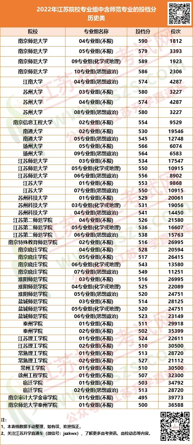 目前只有部分高校公布了2022年具體專業(yè)的錄取分數(shù)(如下)。在此,江蘇招生考試網(wǎng)小編整理了2022年江蘇院校專業(yè)組中含師范專業(yè)的投檔分,供大家參考。
