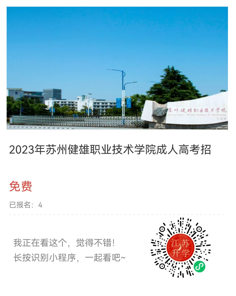 一、學(xué)校簡介 蘇州健雄職業(yè)技術(shù)學(xué)院地處錦繡江南金太倉。太倉,自古人文薈萃、教澤綿長,悠久的歷史形成了獨(dú)具風(fēng)格的婁東文化。新時代的太倉,中德企業(yè)合作基地、中德中小企業(yè)合作示范區(qū)和天然良港太倉港助推太倉產(chǎn)業(yè)升級與經(jīng)濟(jì)高速發(fā)展,“城鄉(xiāng)一體、產(chǎn)城融合,城在田中、園在城中”的田園城市特色逐步呈現(xiàn)。 學(xué)校堅持走校企合作、工學(xué)結(jié)合的人才培養(yǎng)道路,逐漸形成“政行企校”融合發(fā)展特色、“定崗雙元”人才培養(yǎng)特色、“健雄精神”素質(zhì)教育特色、“集聚資源”服務(wù)地方特色。畢業(yè)生就業(yè)競爭力位居省內(nèi)同類院校前列,相繼獲得江蘇省高等教育教學(xué)成果一等獎、特等獎,建立了國內(nèi)唯一的中德雙元制職業(yè)教育示范推廣基地。2015年成為江蘇省示范性高職院校建設(shè)單位。 成人高等教育堅持圍繞生產(chǎn)一線所需的技術(shù)應(yīng)用型人才培養(yǎng)目標(biāo),積極探索具有成人特點的多樣化人才培養(yǎng)模式的改革與創(chuàng)新,為服務(wù)地方經(jīng)濟(jì)建設(shè)提供人才支撐和智力貢獻(xiàn)。在鹽城、連云港兩地設(shè)有函授教學(xué)點,依托學(xué)院精密機(jī)械、港口物流、醫(yī)藥科技等專業(yè)優(yōu)勢,累計培養(yǎng)各類專門人才近萬名。我校成人高等教育將以黨的十九大提出的“完善職業(yè)教育和培訓(xùn)體系,深化產(chǎn)教融合、校企合作”重要精神,以習(xí)近平新時代中國特色社會主義思想為引領(lǐng),堅持“創(chuàng)新、協(xié)調(diào)、綠色、開放、共享”的發(fā)展理念,圍繞學(xué)校提出的“新認(rèn)識、新定位、新使命——打造中國縣域高職教育典范”的目標(biāo),立足行業(yè)、服務(wù)社會,不斷優(yōu)化辦學(xué)結(jié)構(gòu),深化產(chǎn)教融合,充分發(fā)揮高校服務(wù)地方功能,構(gòu)建和完善學(xué)習(xí)型社會和終身教育體系。 二、報名條件 1.成人大專:具有普通高中、中專、職高、技校畢業(yè)證書的畢業(yè)生及具有同等學(xué)力的社會其他人員。 三、招生專業(yè) 四、學(xué)習(xí)費(fèi)用 學(xué)生在校期間的學(xué)習(xí)費(fèi)用,嚴(yán)格按江蘇省蘇價費(fèi)(2007)271號文件規(guī)定執(zhí)行(文史類專業(yè)1700元/學(xué)年、理工類專業(yè)1900元/學(xué)年),書籍講義費(fèi)等自理。(如有新文件規(guī)定則按新標(biāo)準(zhǔn)執(zhí)行) 五、考試科目 高起專理工類(550)需考語文、數(shù)學(xué)(理)、外語;文史類(510)需考語文、數(shù)學(xué)(文)、外語。 六、畢業(yè)與學(xué)位 成人大專:學(xué)生修完本專業(yè)教學(xué)計劃規(guī)定的課程(英語、計算機(jī)全省統(tǒng)考),成績合格,符合畢業(yè)條件者,由常州機(jī)電職業(yè)技術(shù)學(xué)院頒發(fā)經(jīng)省教育廳驗印和國家教育部電子注冊的成人高等教育??飘厴I(yè)文憑。 七、報名方式 在線報名:登錄江蘇升學(xué)指導(dǎo)中.心成人高考預(yù)報名系統(tǒng),填寫個人姓名、聯(lián)系電話、選擇院校及專業(yè),提交的報名信息后工作人員將會在24小時內(nèi)進(jìn)行回復(fù)確認(rèn)。 七、考試流程 九、報名咨詢 小程序免費(fèi)報名→填入個人信息→等候招生老師聯(lián)系(1—3個工作日) 直接聯(lián)系招生老師
