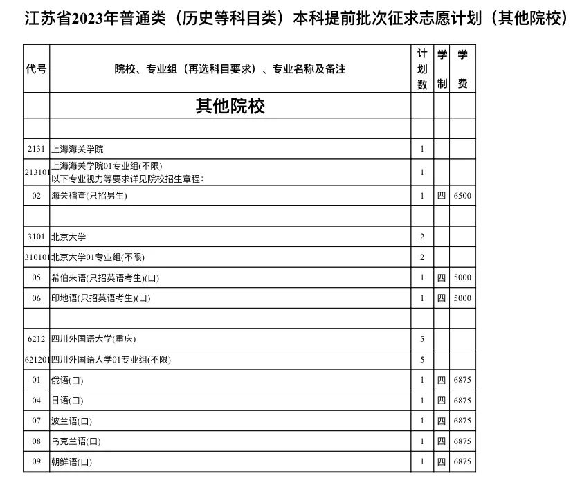 江蘇省2023年普通類(歷史等科目類)本科提前批次征求志 愿計(jì)劃(其他院校).xls