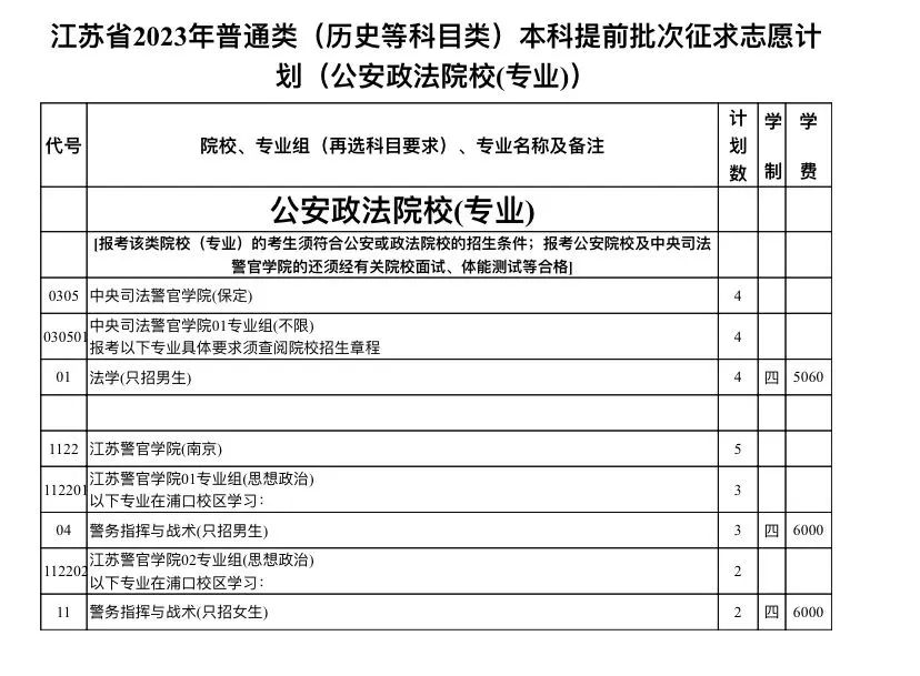 江蘇省2023年普通類(歷史等科目類)本科提前批次征求志 愿計(jì)劃(公安政法院校(專業(yè))).xls