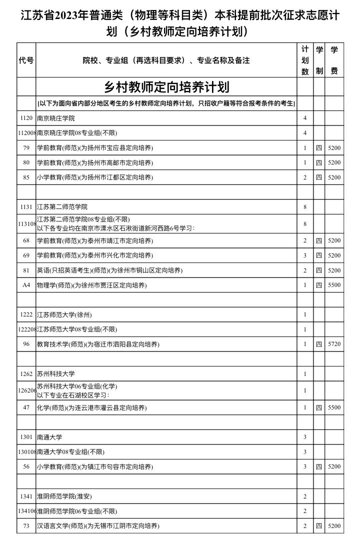 江蘇省2023年普通類(物理等科目類)本科提前批次征求志 愿計(jì)劃(鄉(xiāng)村教師定向培養(yǎng)計(jì)劃).xls