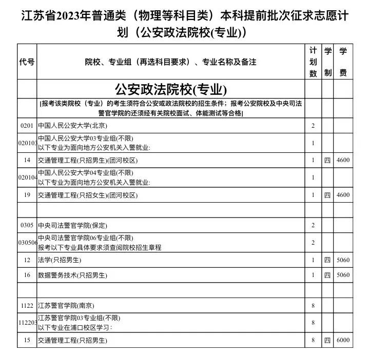 江蘇省2023年普通類(物理等科目類)本科提前批次征求志 愿計(jì)劃(公安政法院校(專業(yè))).xls