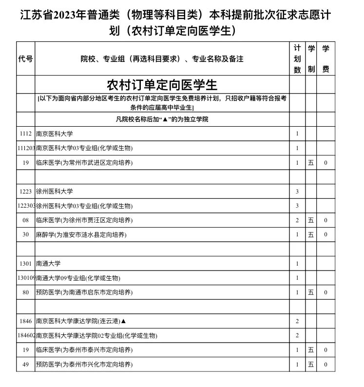 江蘇省2023年普通類(物理等科目類)本科提前批次征求志 愿計(jì)劃(農(nóng)村訂單定向醫(yī)學(xué)生).xls