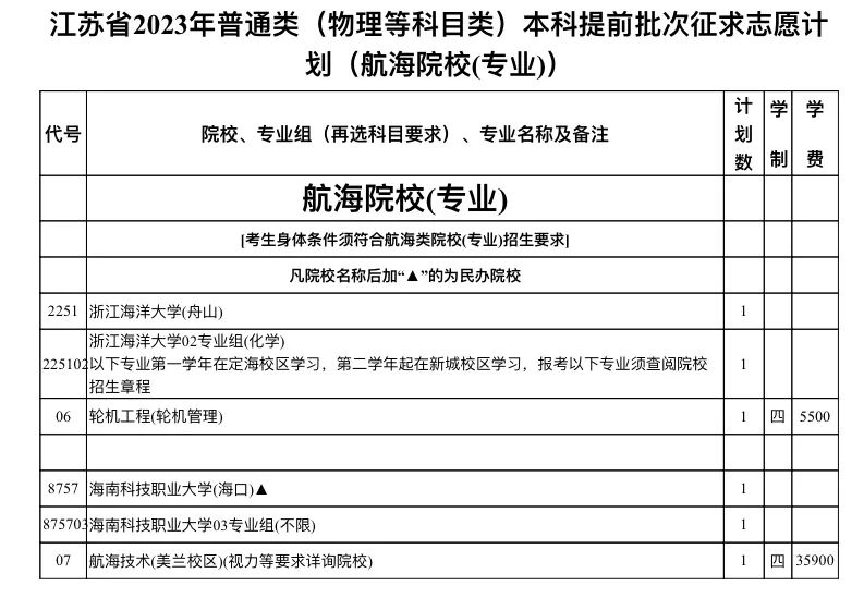 江蘇省2023年普通類(物理等科目類)本科提前批次征求志 愿計(jì)劃(航海院校(專業(yè))).xls