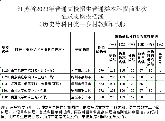 江蘇2023年普通類本科提前批征求志 愿投檔線(鄉(xiāng)村教師計(jì)劃)