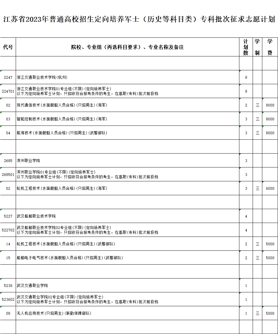 江蘇省2023年普通高校招生定向培養(yǎng)軍士專科批次征求志愿計劃