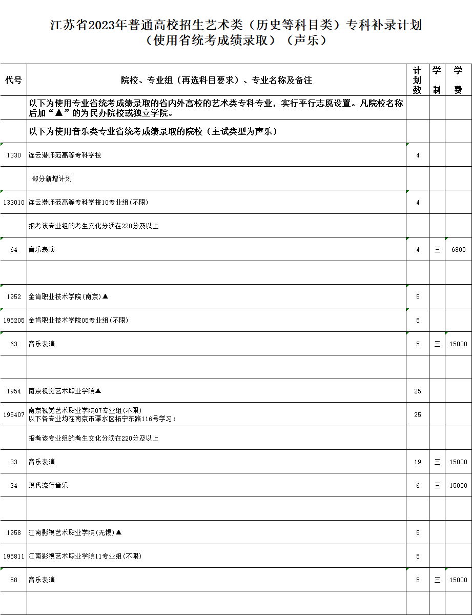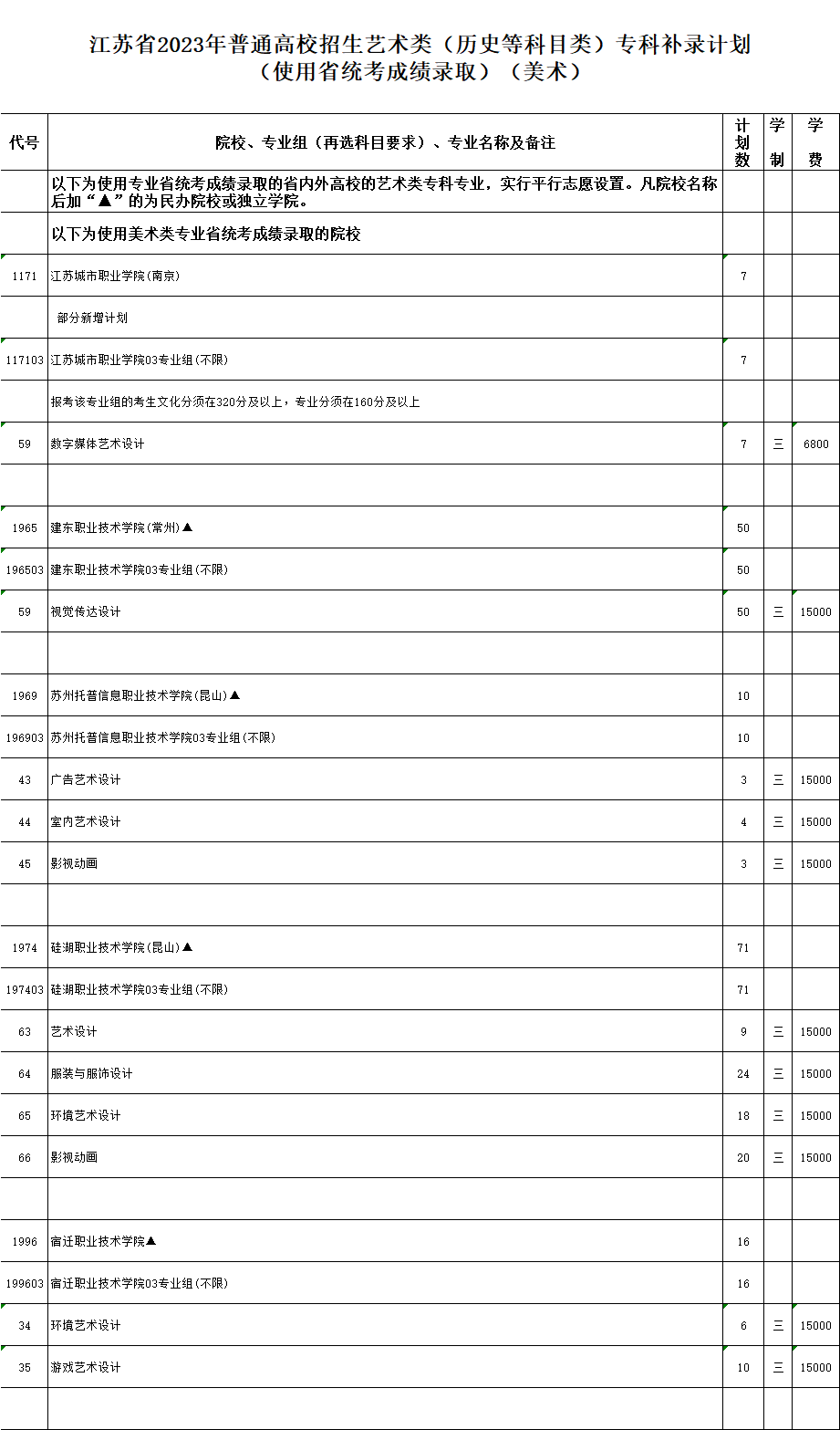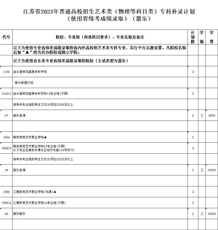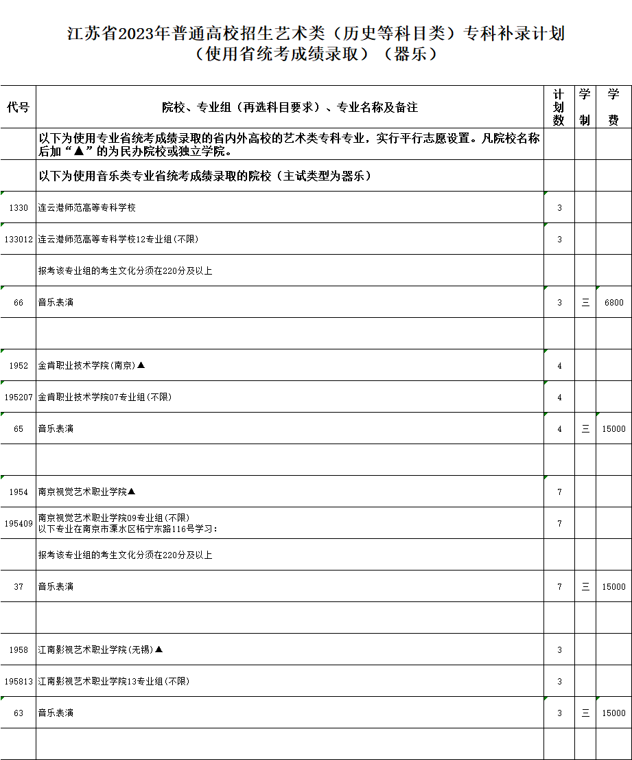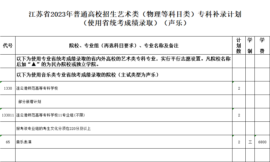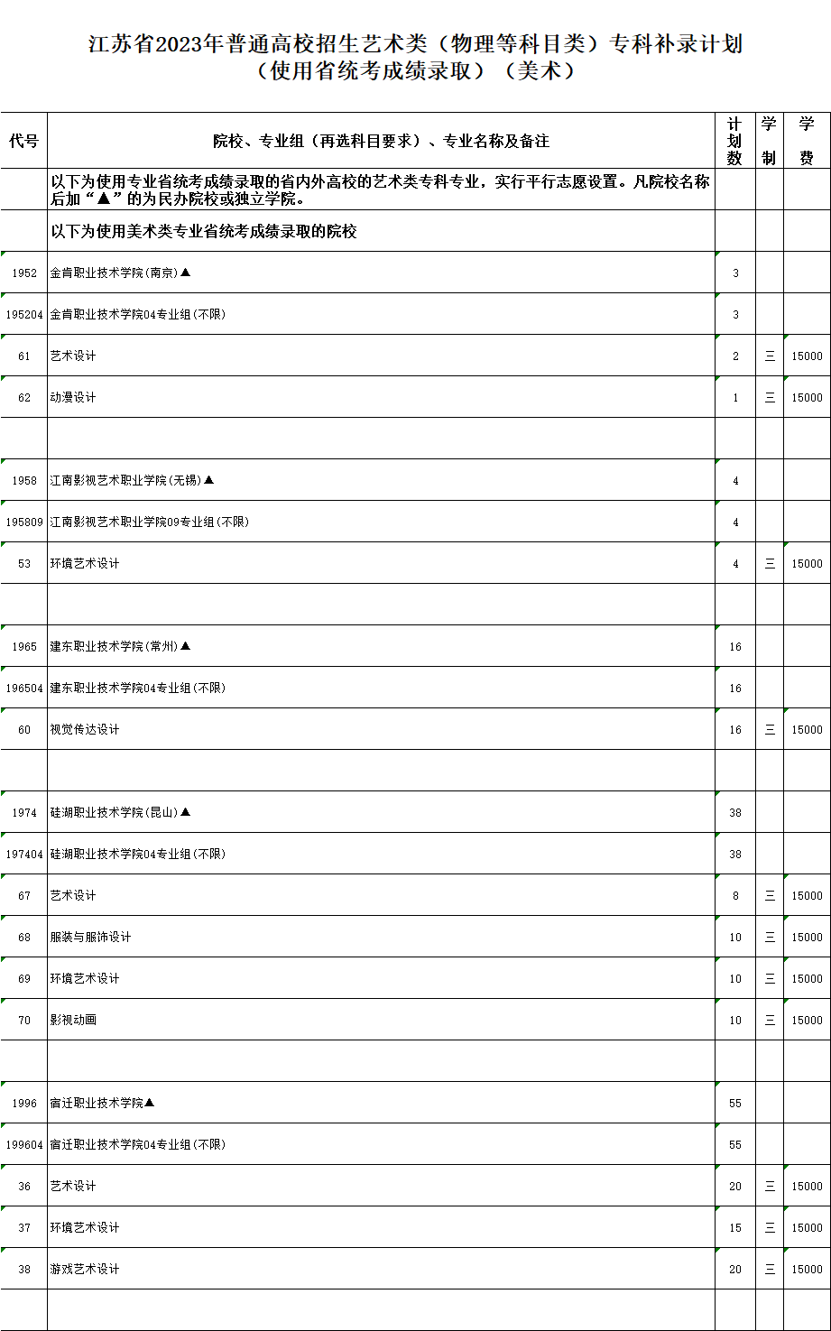 江蘇省2023年普通高校招生專科補錄計劃