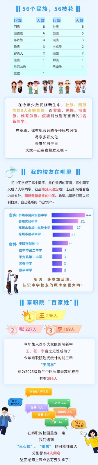 泰州職業(yè)技術(shù)學(xué)院2023級新生大數(shù)據(jù)出爐啦!是否也在關(guān)心新同學(xué)們都來自哪些省份?最大年齡差多少歲?是不是還想知道今年的男女比例?有哪些少數(shù)民族的兄弟姐妹?……別急!跟著江蘇招生考試網(wǎng)小編一起來看看泰州職業(yè)技術(shù)學(xué)院2023級新生大數(shù)據(jù)吧。